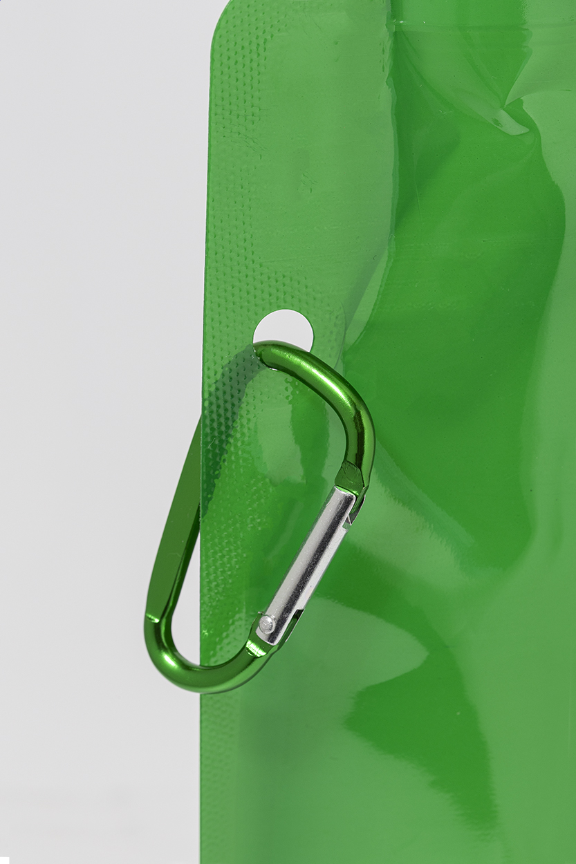 Faltbare RPET Trinkflasche mit Trinkdeckel und Karabiner aus Aluminium. Füllmenge: 500 ml. BPA-frei. Nicht geeignet für kohlensäurehaltige Getränke.