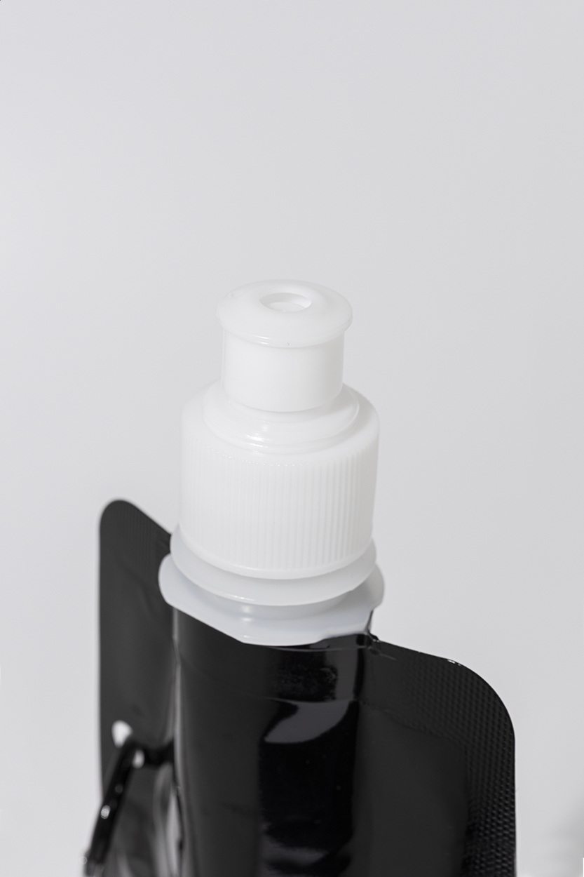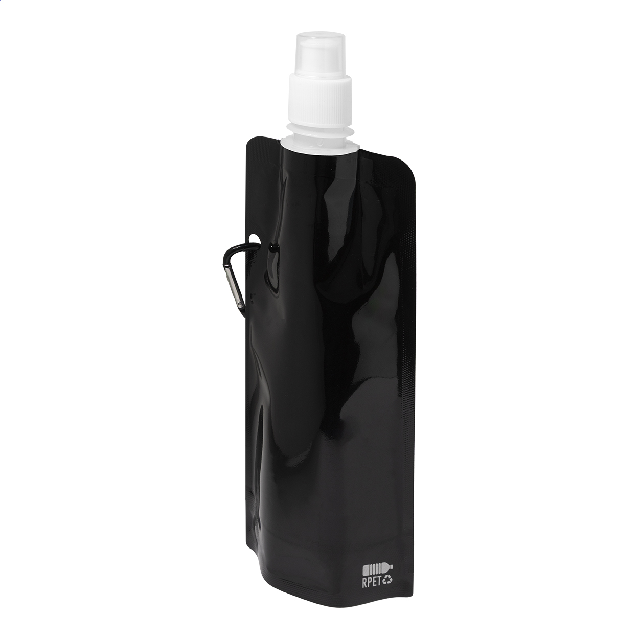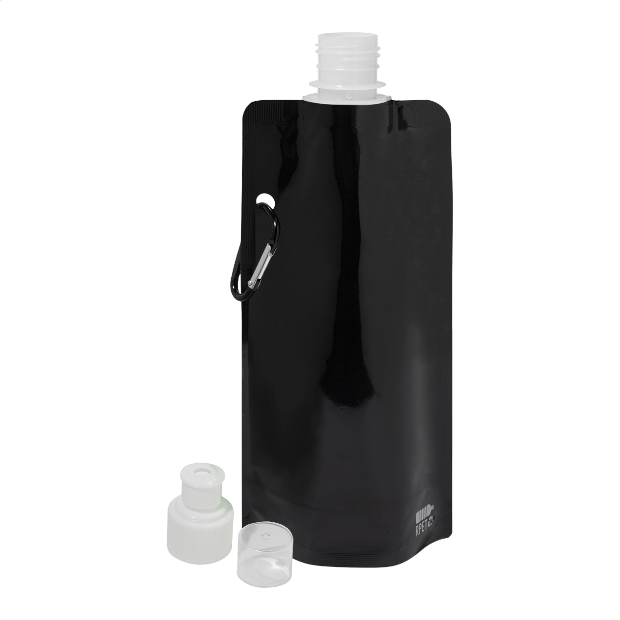 Faltbare RPET Trinkflasche mit Trinkdeckel und Karabiner aus Aluminium. Füllmenge: 500 ml. BPA-frei. Nicht geeignet für kohlensäurehaltige Getränke.
