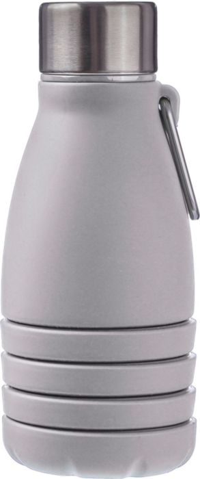 Faltbare Silikon-Trinkflasche (550 ml) mit Edelstahldeckel und Aluminium-Karabinerhaken. Gefaltetes Format: ø7 x 17 cm, ungefaltetes Format: ø7 x 25 cm. Als Großpackung verpackt.