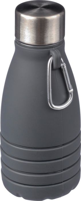 Faltbare Silikon-Trinkflasche (550 ml) mit Edelstahldeckel und Aluminium-Karabinerhaken. Gefaltetes Format: ø7 x 17 cm, ungefaltetes Format: ø7 x 25 cm. Als Großpackung verpackt.