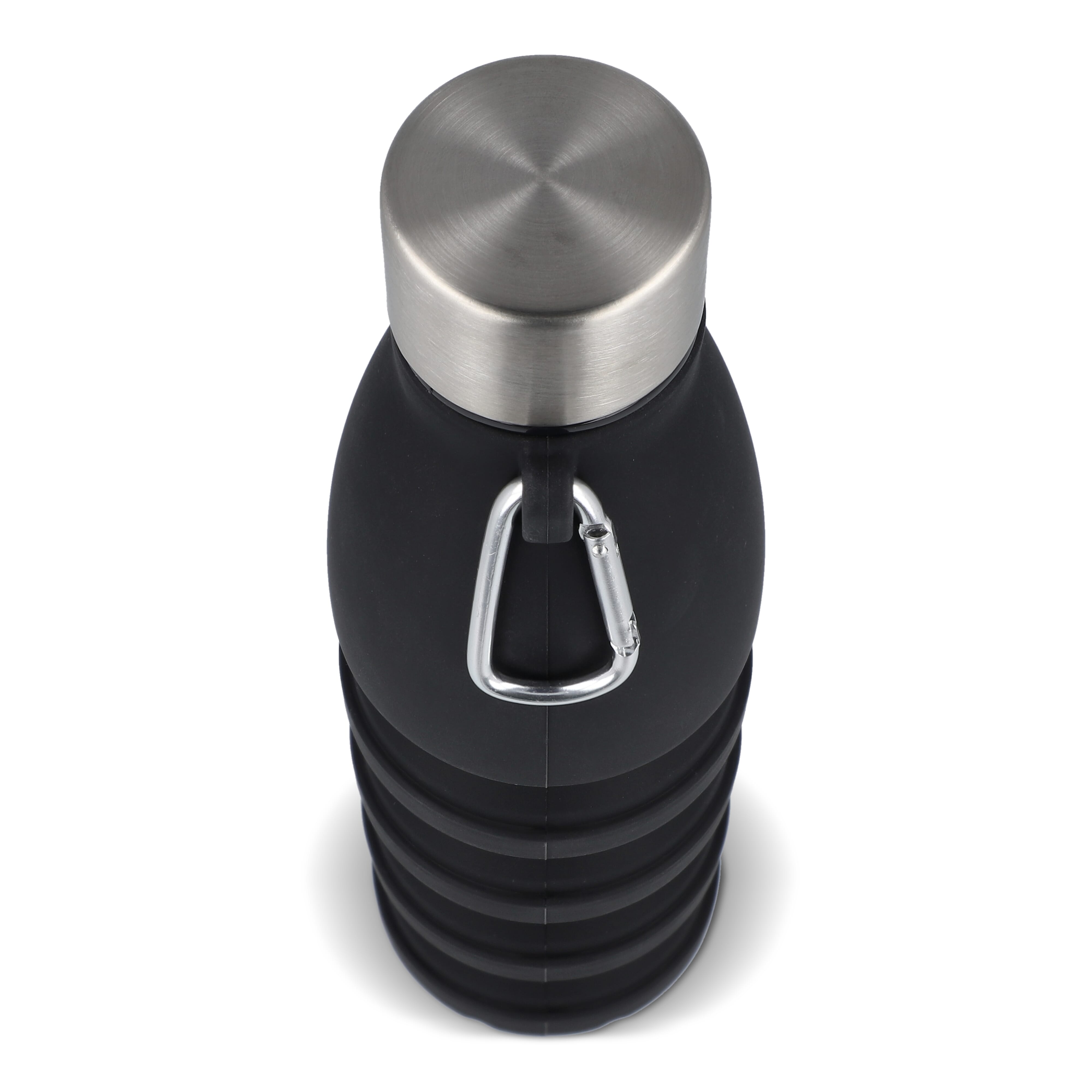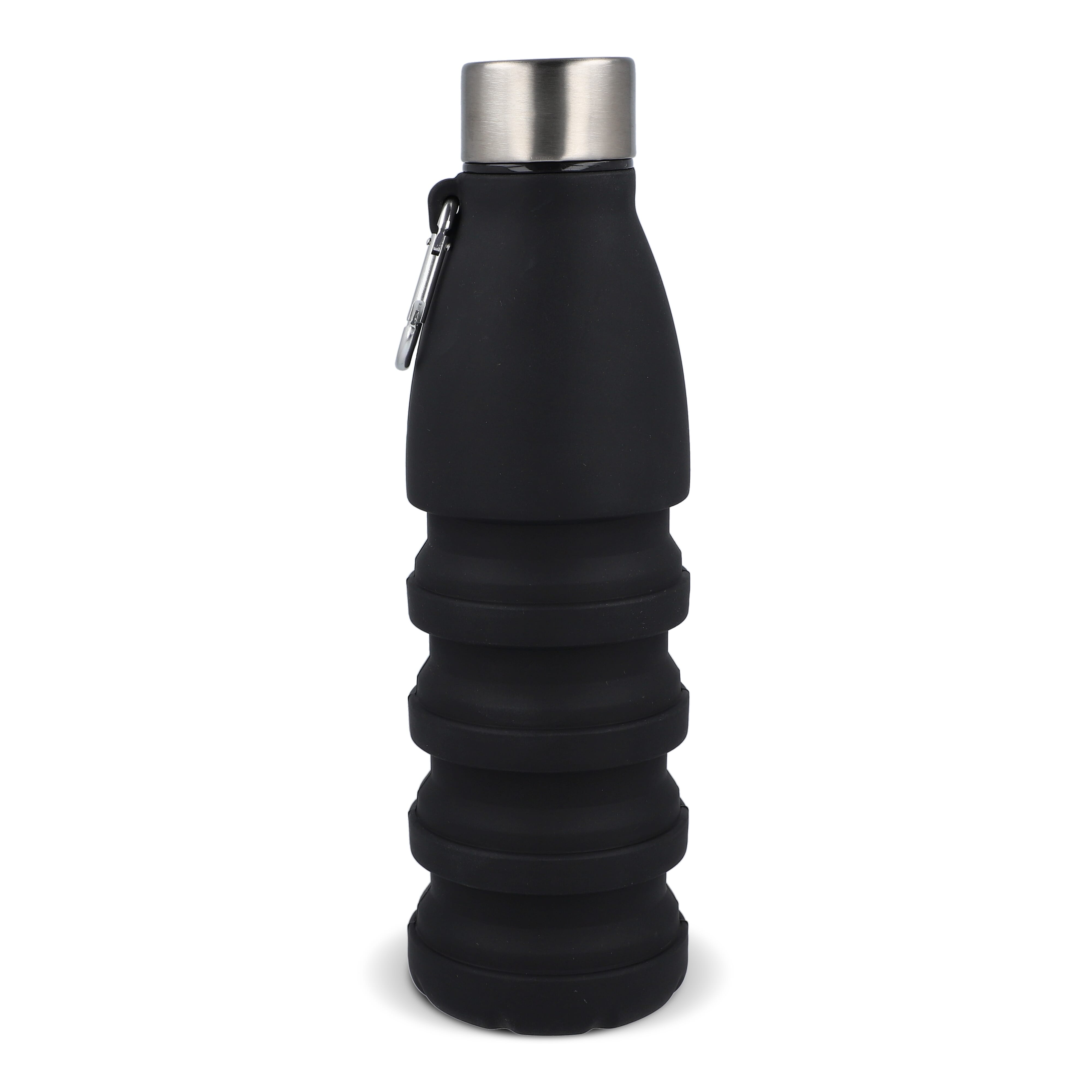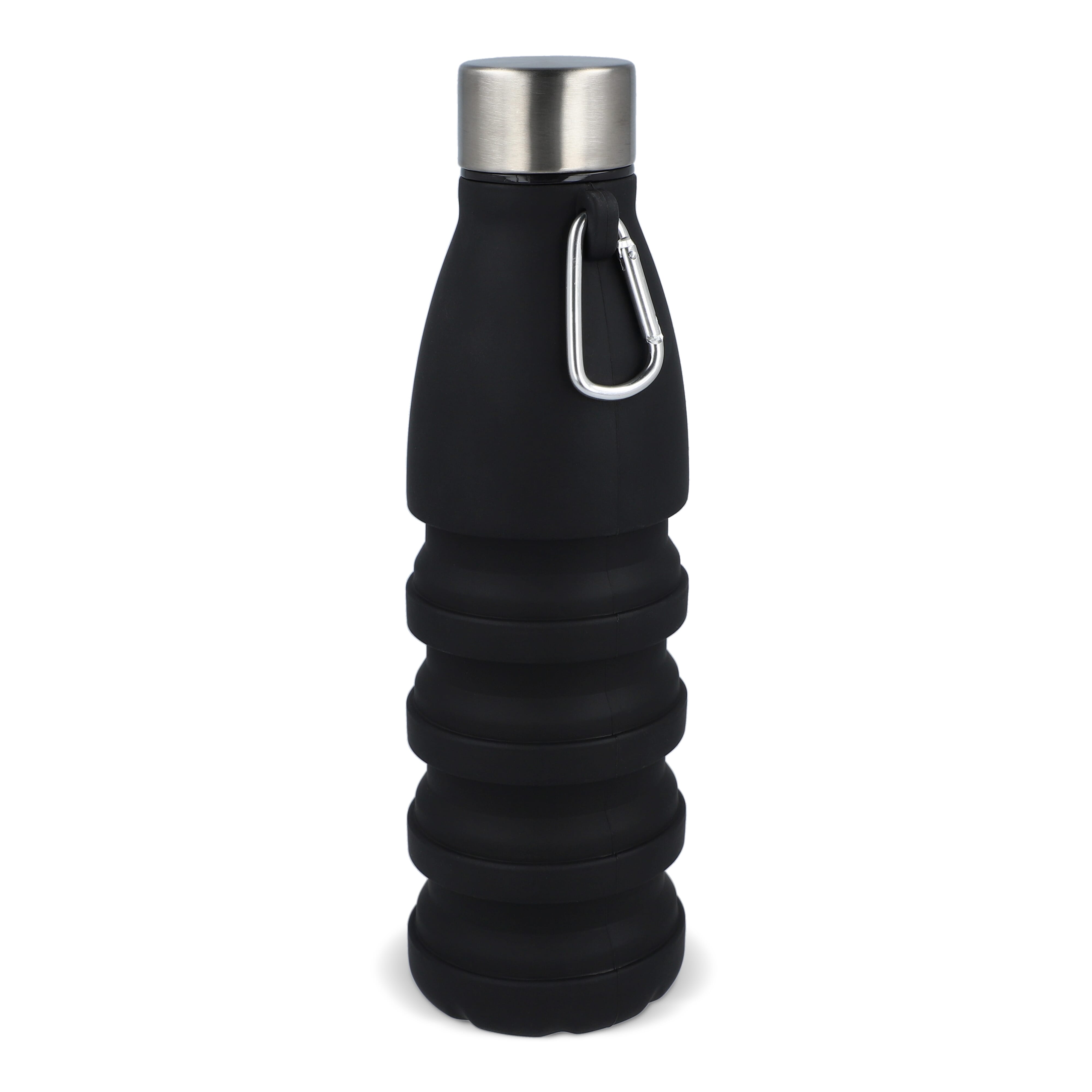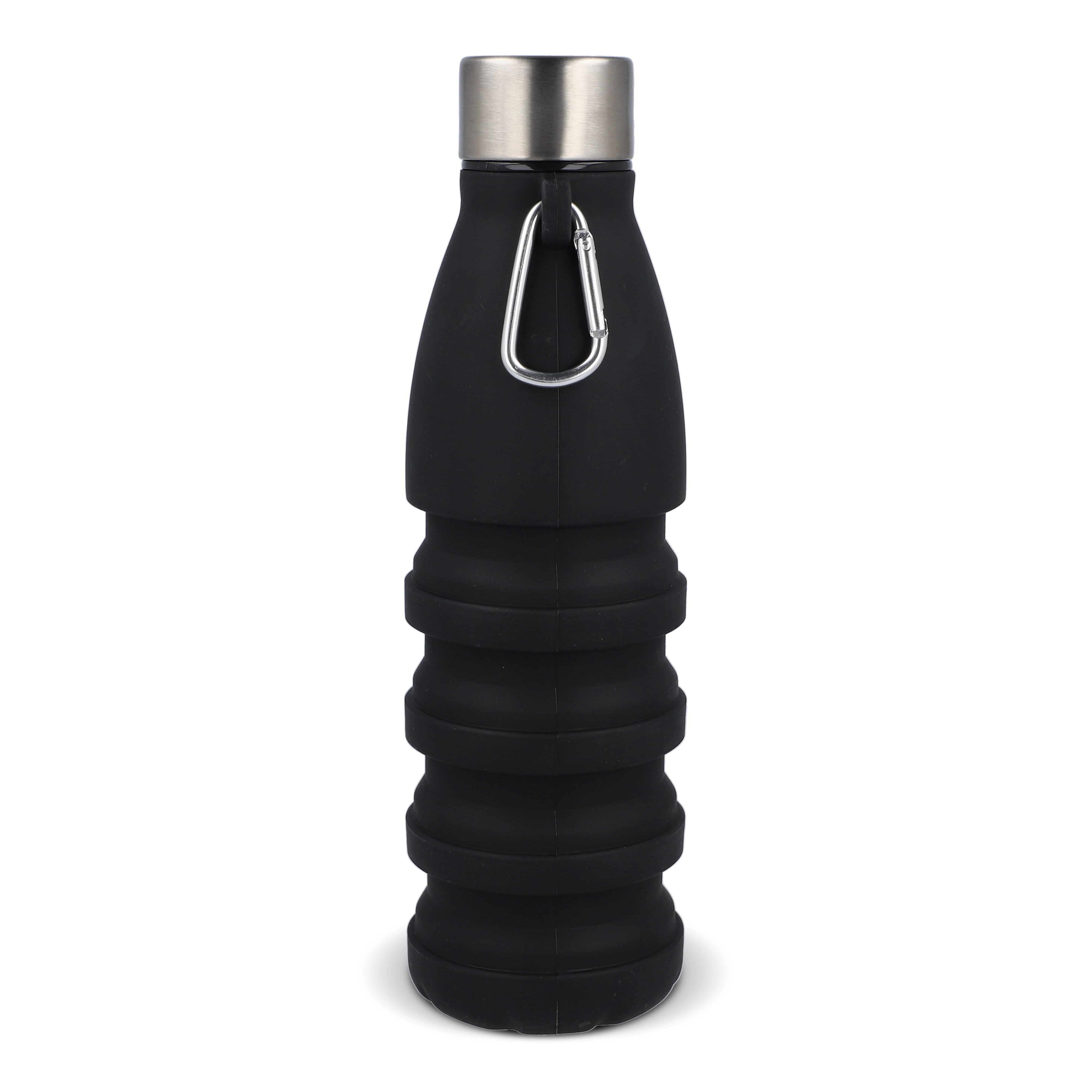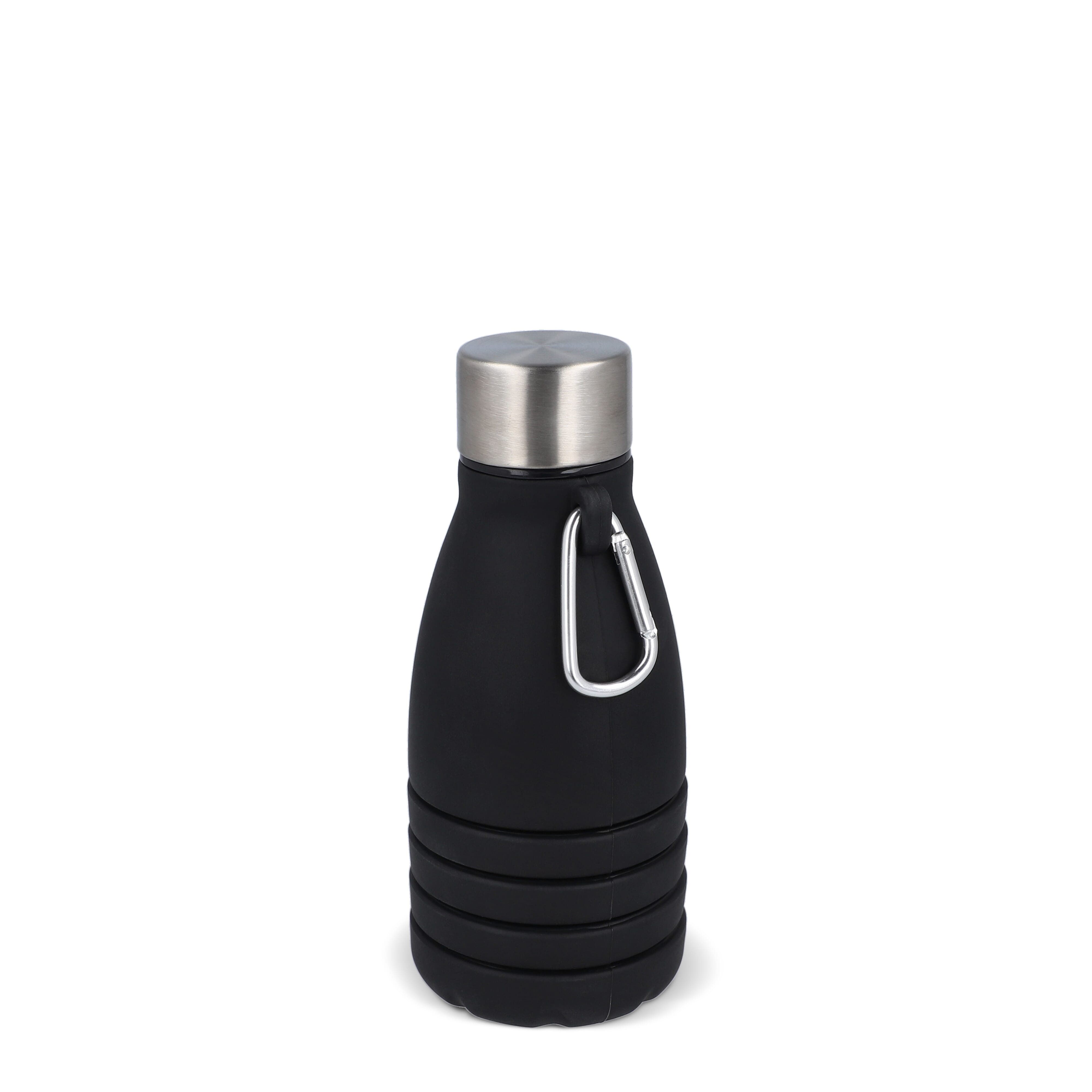 Faltbare Wasserflasche aus Silikon mit Karabinerhaken zum Befestigen an Ihrer Tasche. Sie fasst 550 ml Flüssigkeit.