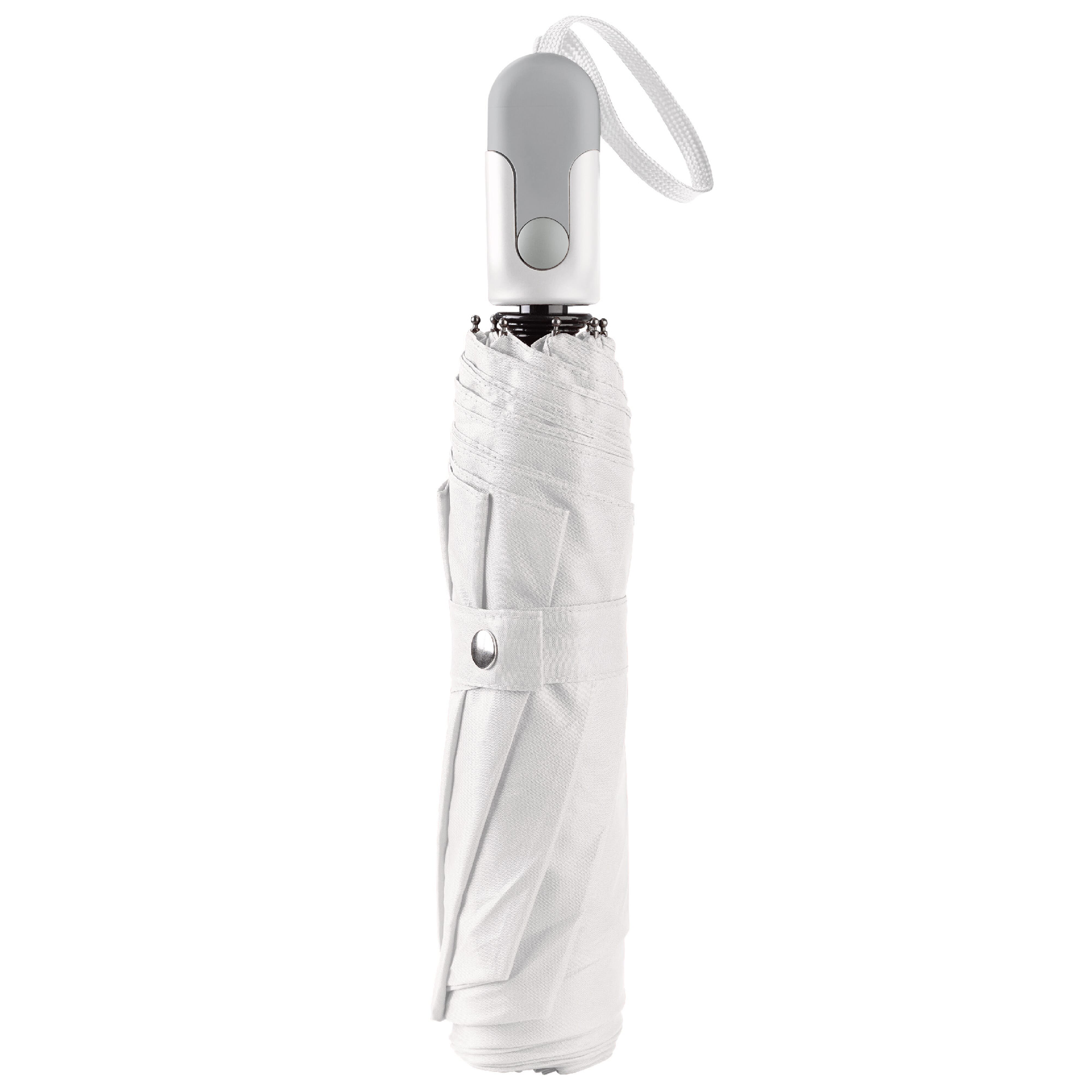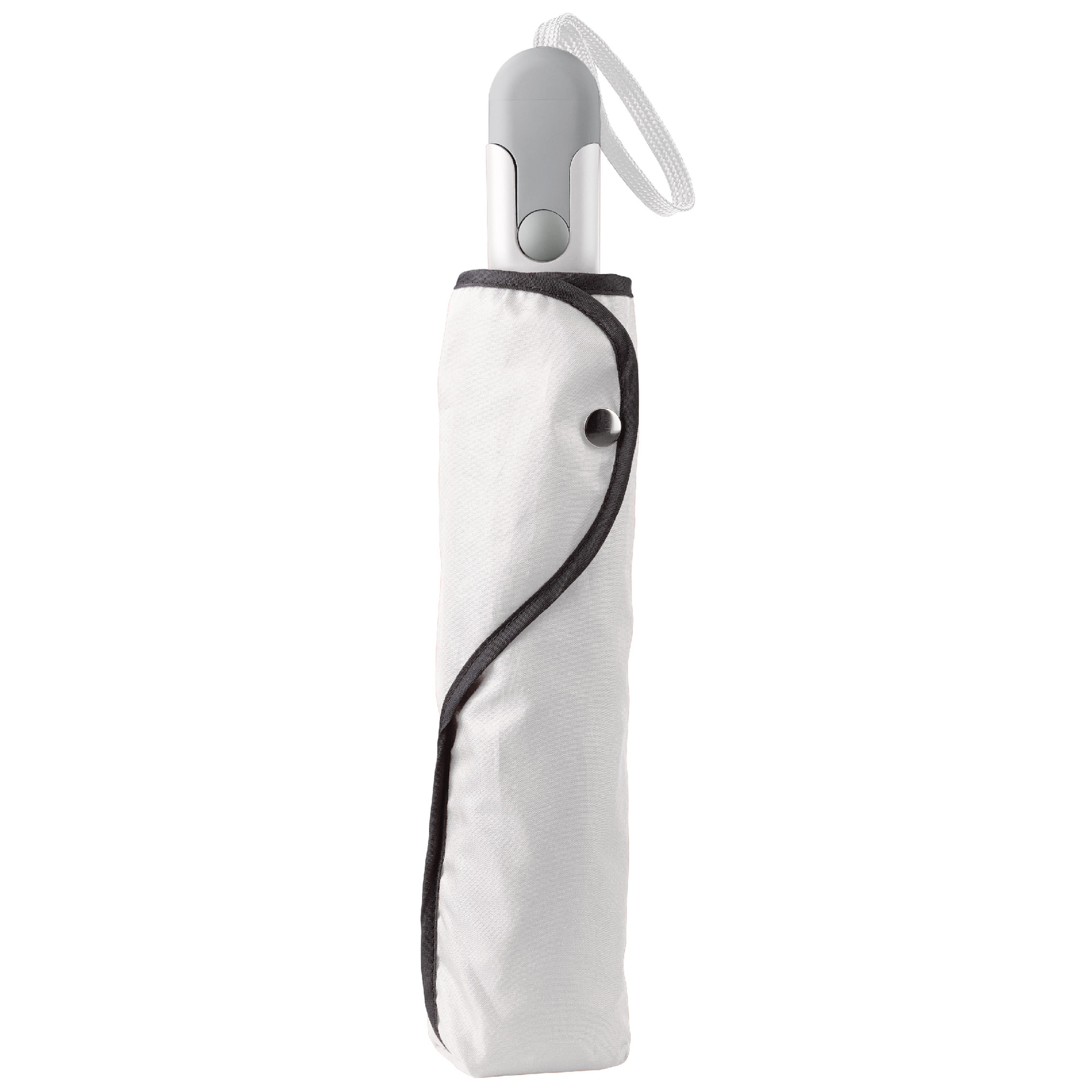 Schöner faltbarer Regenschirm mit Hülle und ergonomischem Designgriff. Die Verstrebungen des Gestells sind aus Fiberglas für zusätzliche Haltbarkeit. Das schwarze Gestell bildet einen schönen Kontrast zum weißen Schirmdach.