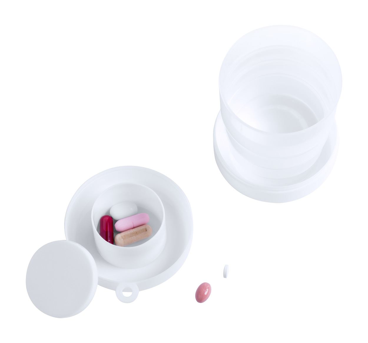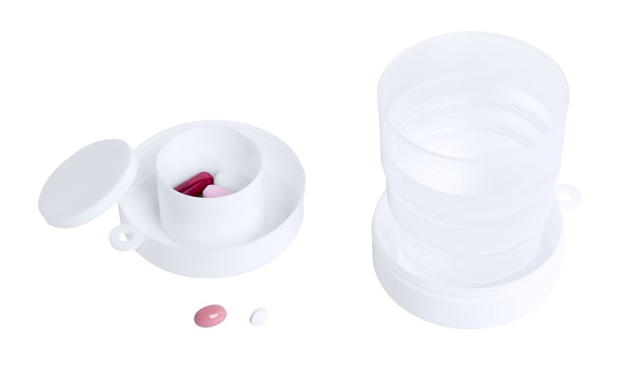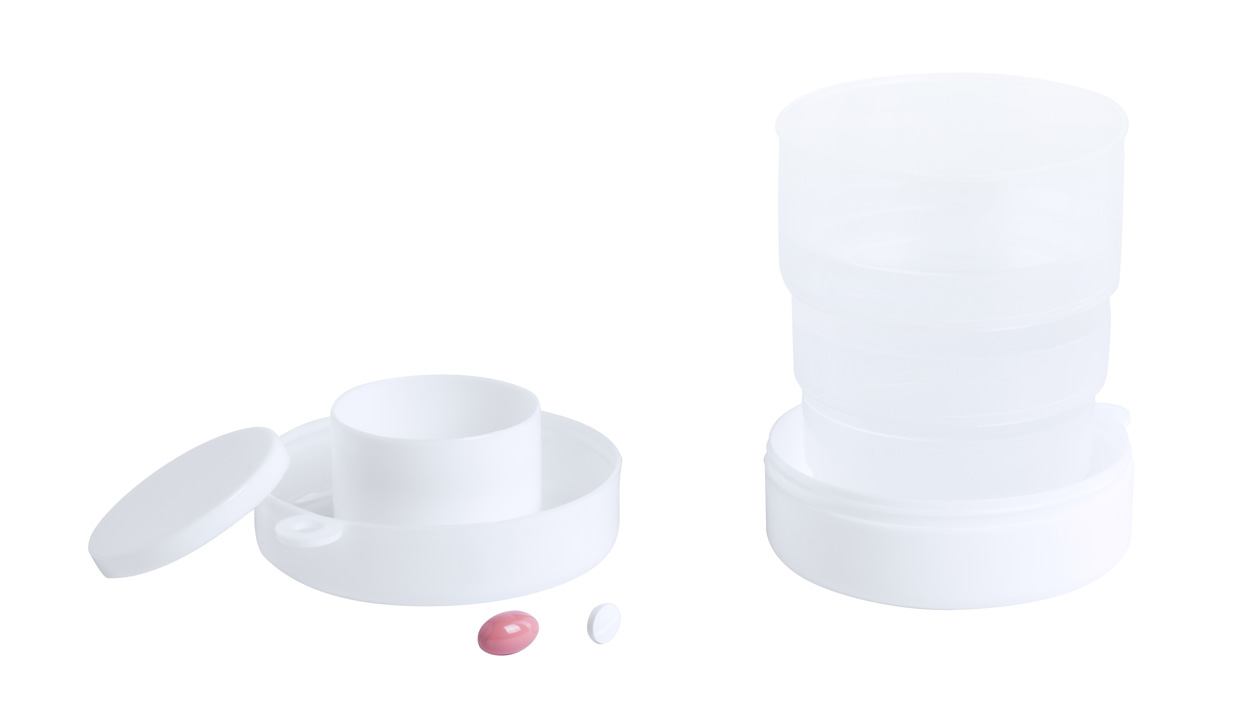 Faltbarer Kunststoff-Becher (220 ml) mit Tablettenfächern. Einzeln in Kunststoffetui mit Karabiner.