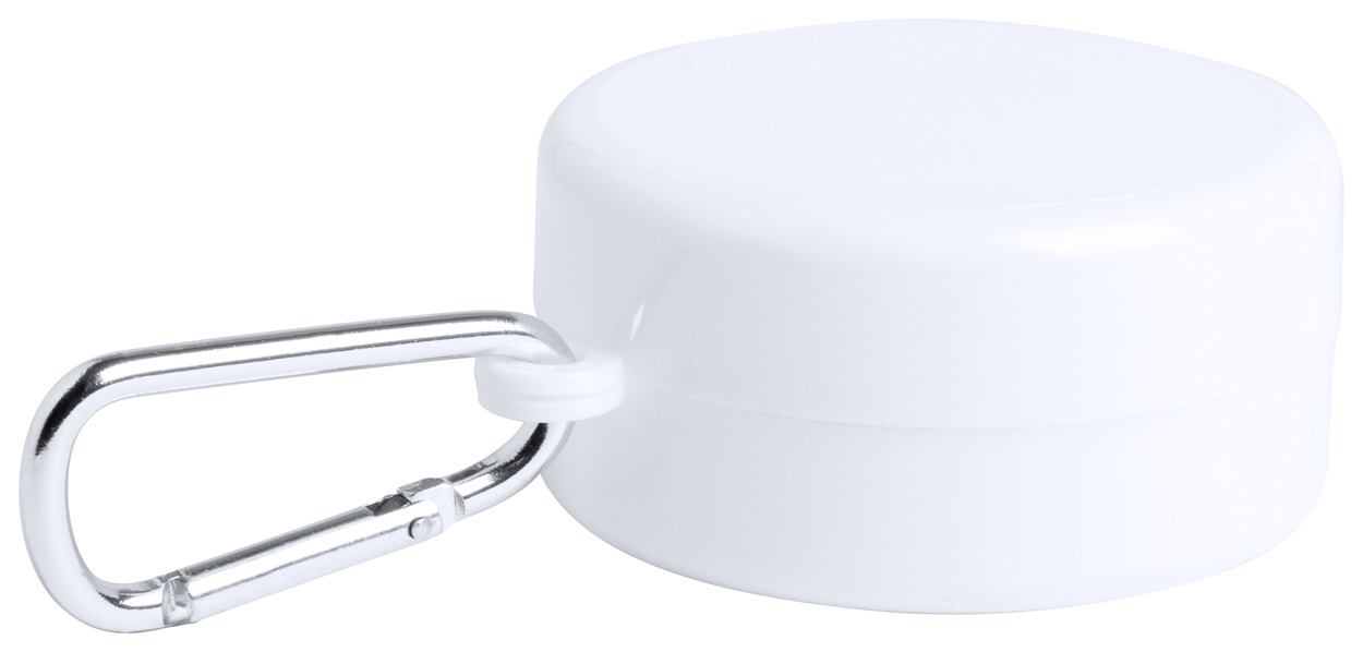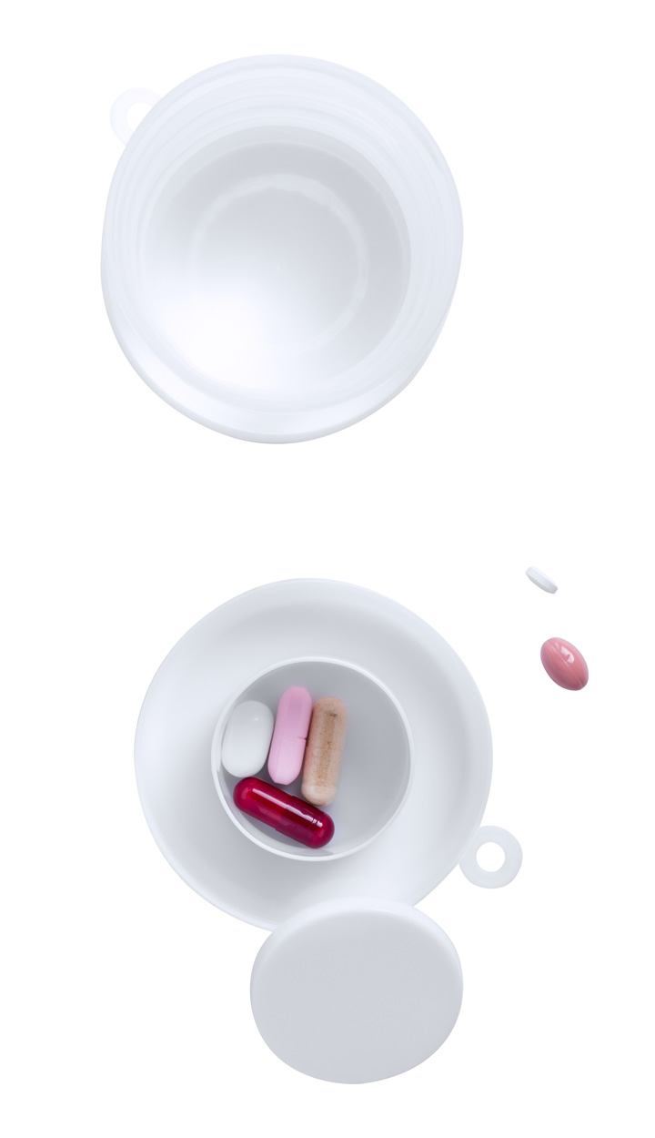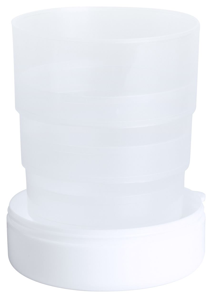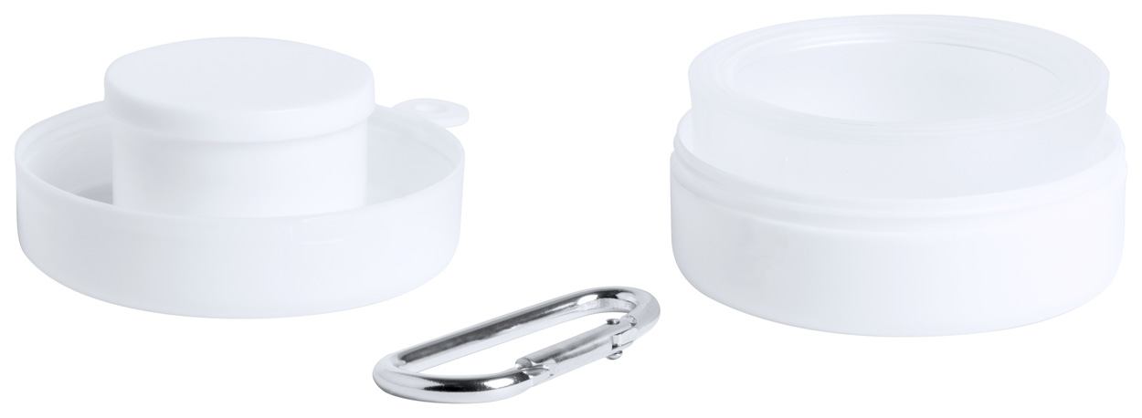 Faltbarer Kunststoff-Becher (220 ml) mit Tablettenfächern. Einzeln in Kunststoffetui mit Karabiner.