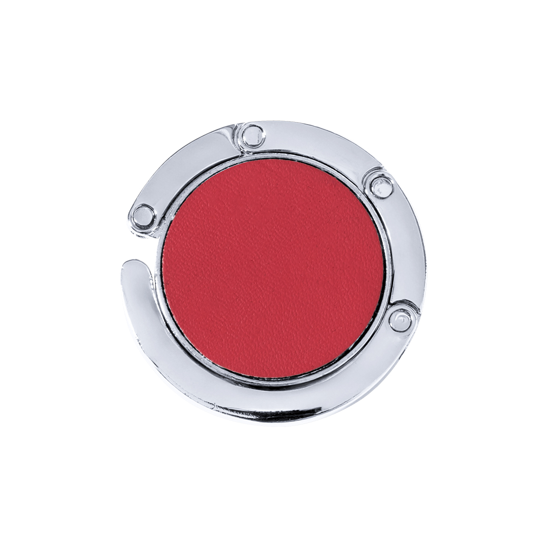 Klappbarer Handtaschenhalter aus Metall mit Kunstledereinsatz in leuchtenden Farben. Präsentiert in einer individuellen Box mit Stanzung im Inneren.