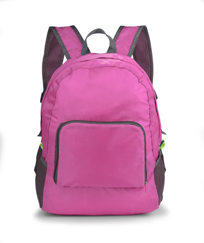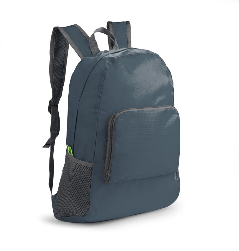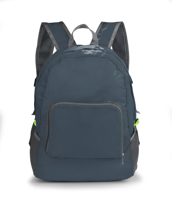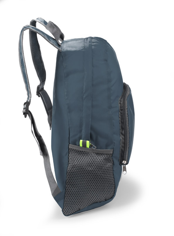 Funktioneller Rucksack, der klein zusammengeklappt werden kann. Es hat eine Innentasche und drei Außentaschen - eine mit Reißverschluss und zwei Netztaschen. Der Rucksack ist aus Polyester hergestellt.