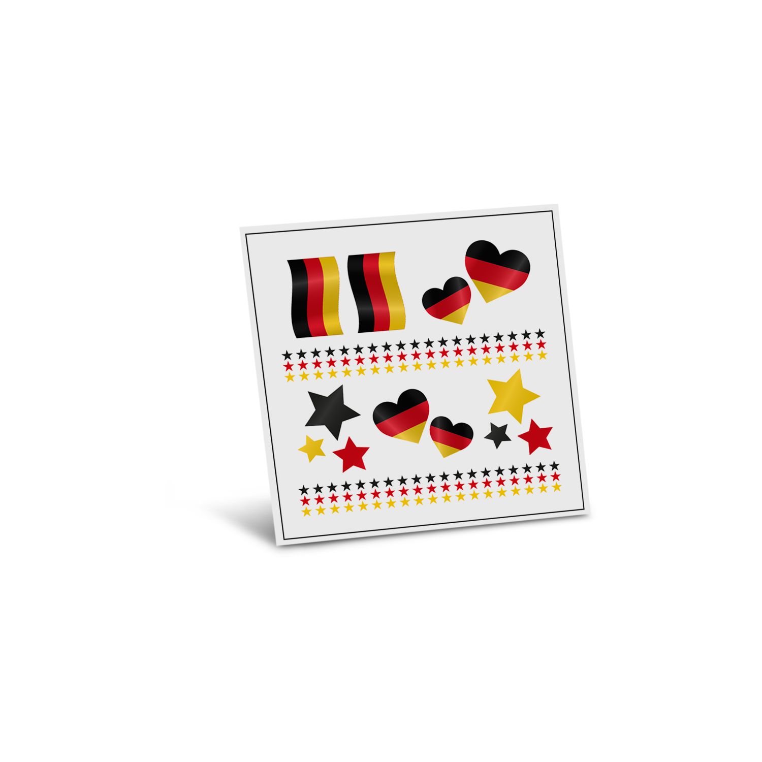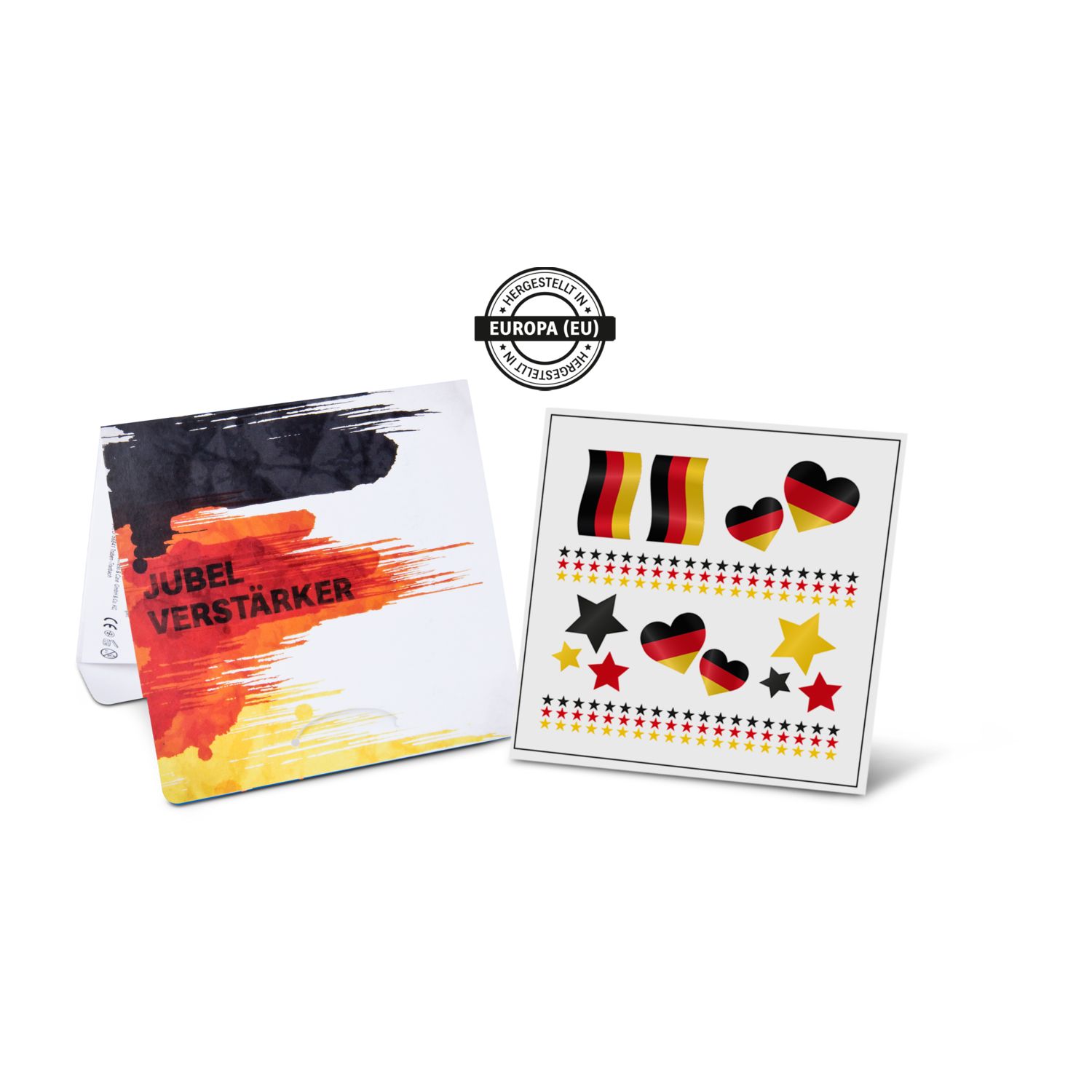 Sport-Events bewegen Deutschland wie keine andere Veranstaltung. Nutzen Sie die positiven Emotionen rund um Fankurven, Expertenparties und Public Viewing Veranstaltungen auch für Ihre Werbung. Helfen Sie Ihren Kunden, Mitarbeitern oder Geschäftspartnern unsere Mannschaft zu bejubeln: mit unseren Fan-Tattoos als Jubelverstärker! Jedes Set enthält 8 Tattoos in Deutschlandfarben: 2 x 2 Herzen, 2 Fahnen, 2 x 3 schwarz-rot- goldene Sterne und 2 Sternarmbänder. Ab einer Anzahl von nur 500 Stück ist auch eine Eigengestaltung der Tattoos möglich - sprechen Sie uns an! Hergestellt in Europa. Dermatologisch getestet.