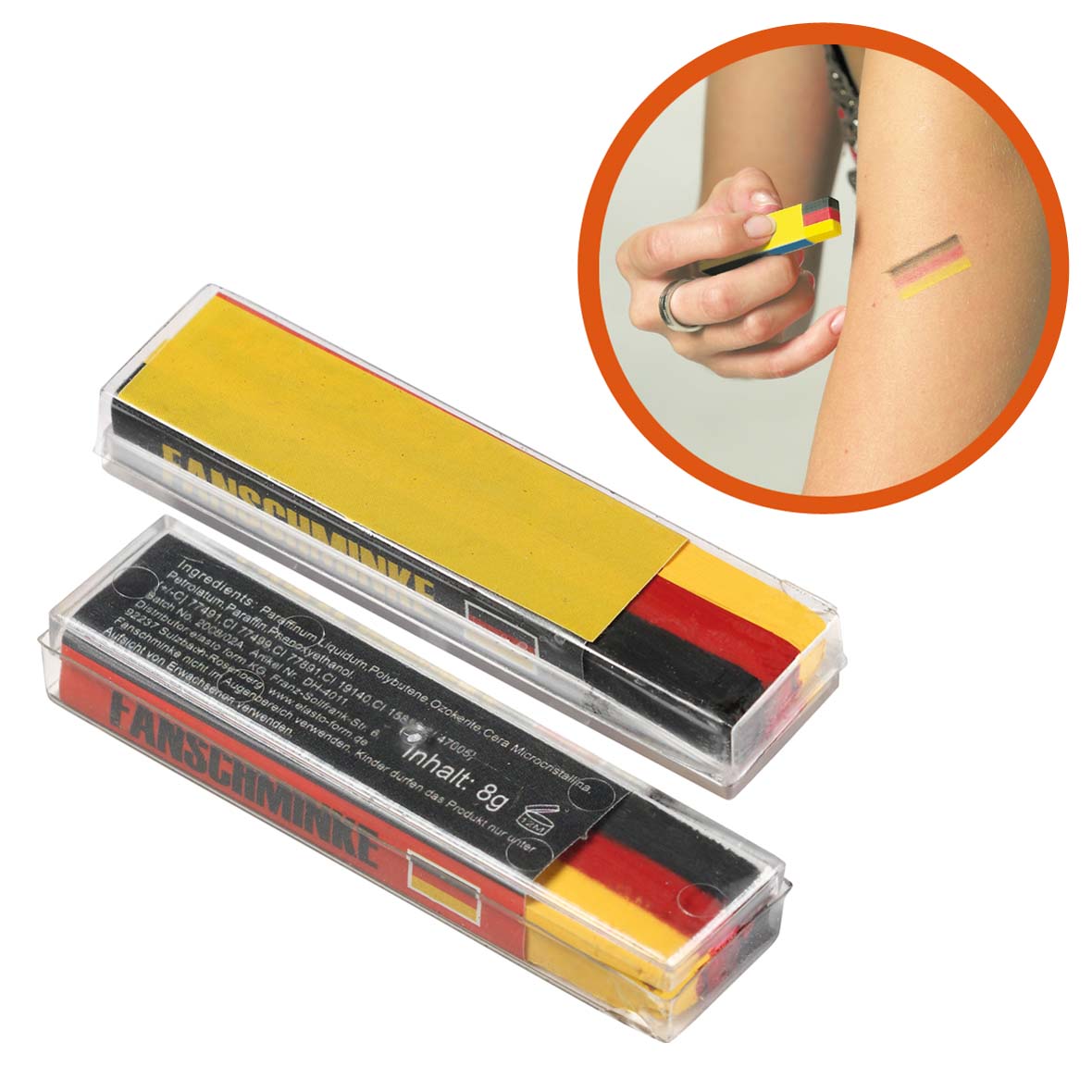 So gelingt die perfekte Deutschlandfahne im Nu! Praktische Fanschminke für eine einfache Anwendung: Ansetzen, Aufzeichnen – Fertig! Hautverträglich und rückstandslos abwaschbar.