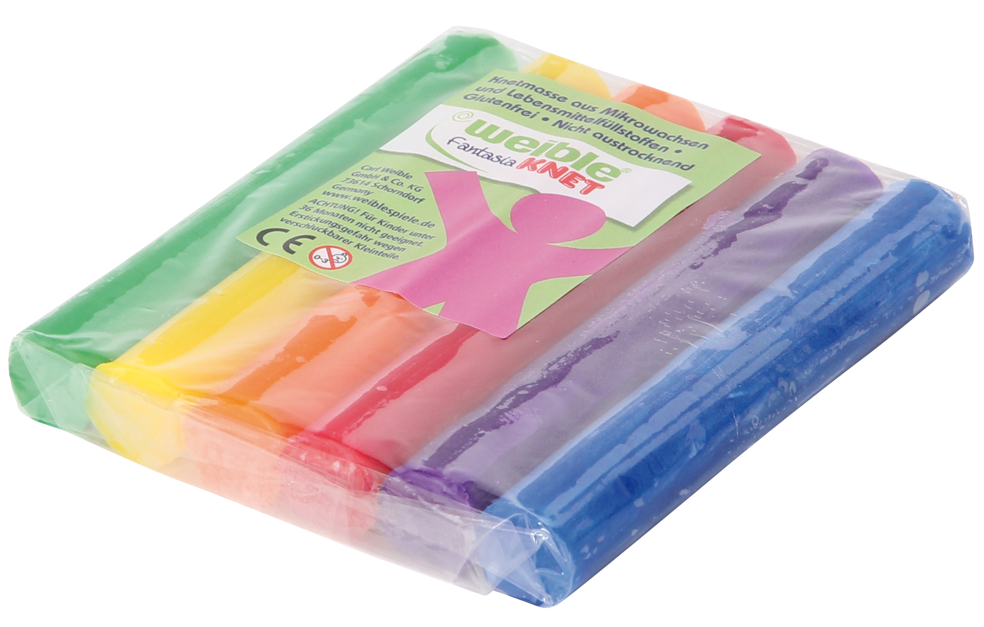 25 Gramm Knete pro Rolle in den Farben rot, orange, gelb, grün, blau und lila. Die gesundheitlich unbedenkliche Knetmasse wird seit mehr als 100 Jahren in Deutschland aus Mikrowachsen, Kartoffelstärke und Farben in hoher Qualität hergestellt. Sie ist glutenfrei und nicht austrocknend.