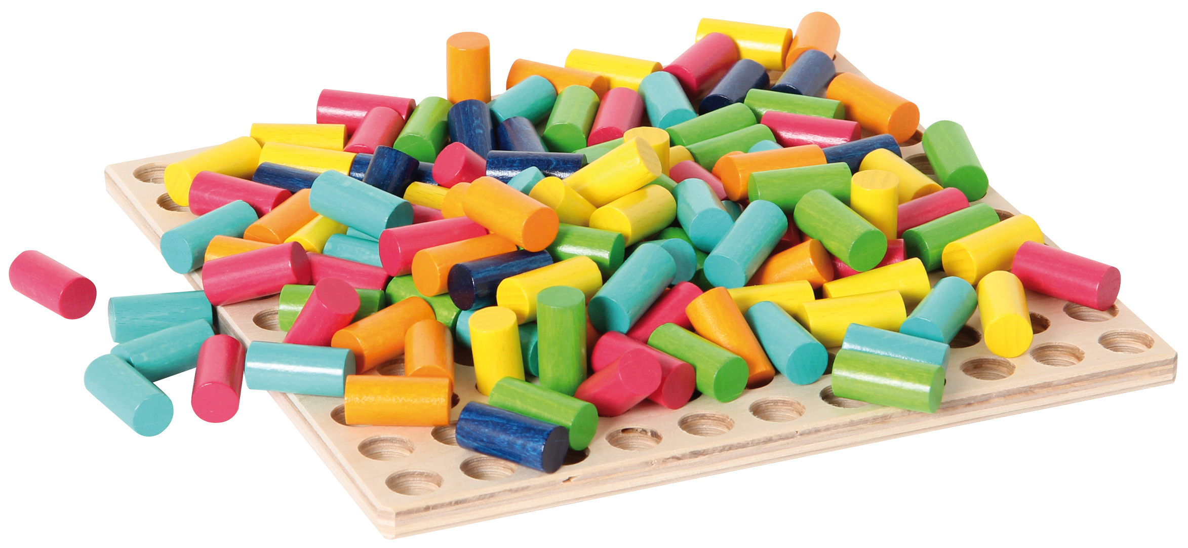 Mit den 121 massiven Holzstäbchen in allen Regenbogenfarben lassen sich die Bilder der Vorlagenkarte auf der Spielfläche nachstecken, aber auch unzählige eigene Kreationen erschaffen. Fördert die Feinmotorik und das Farbverständnis. Made in Germany.