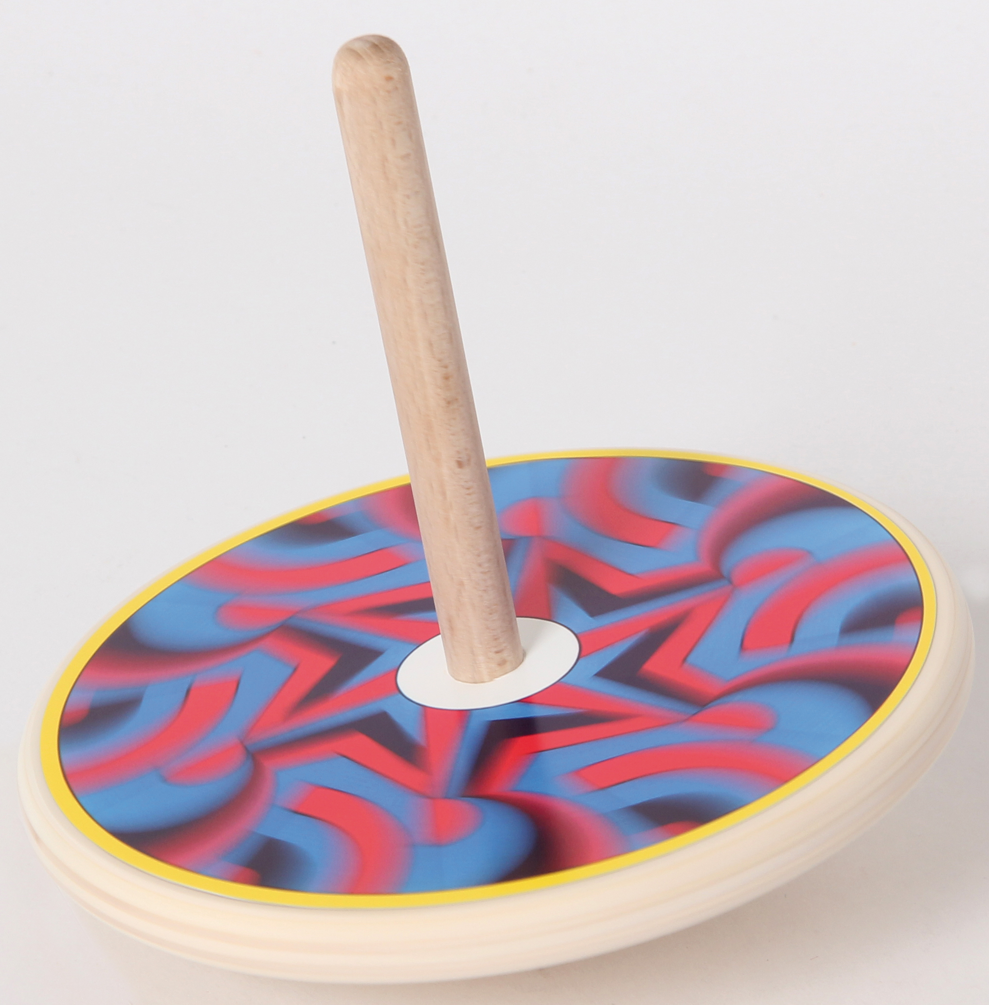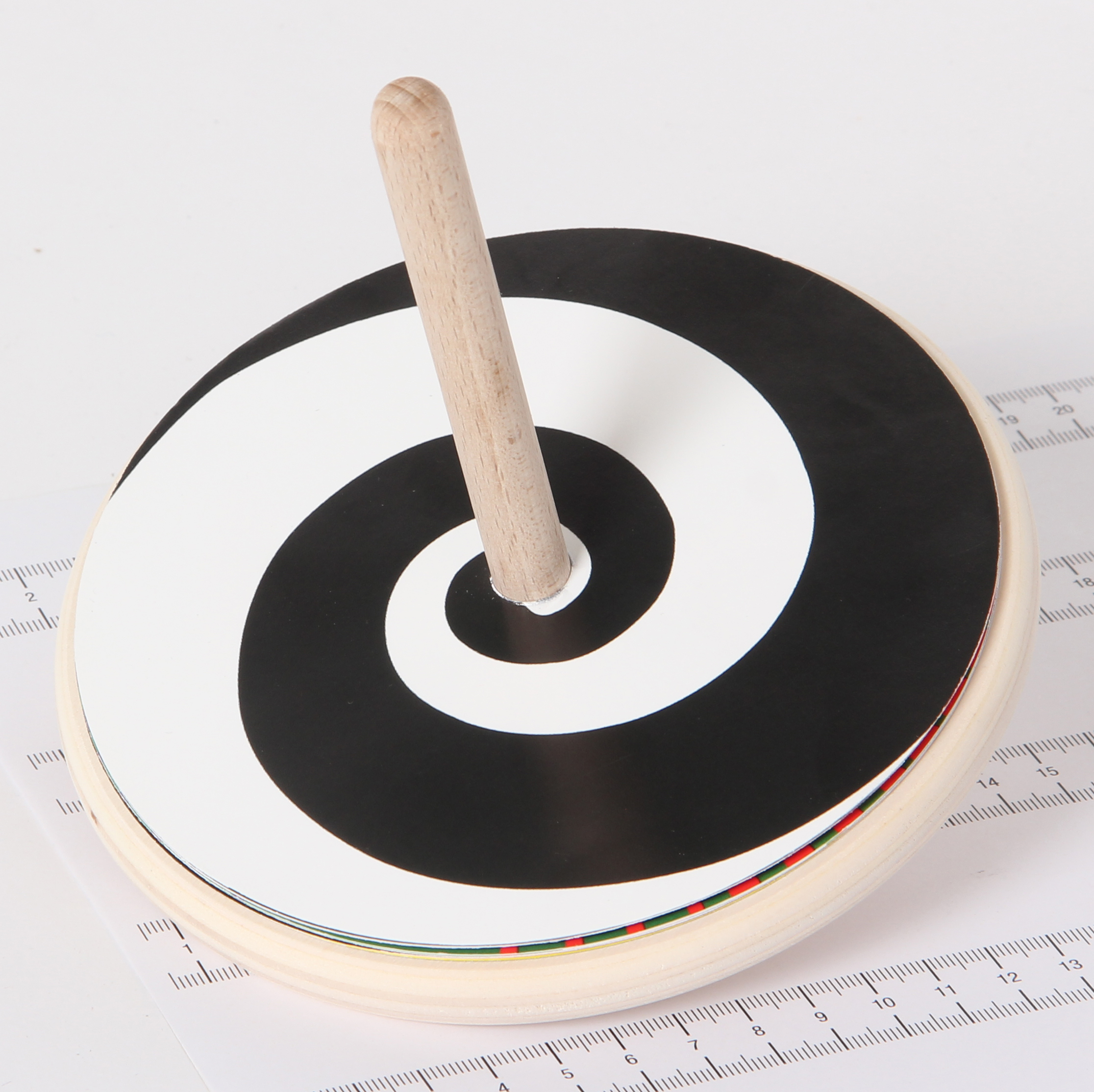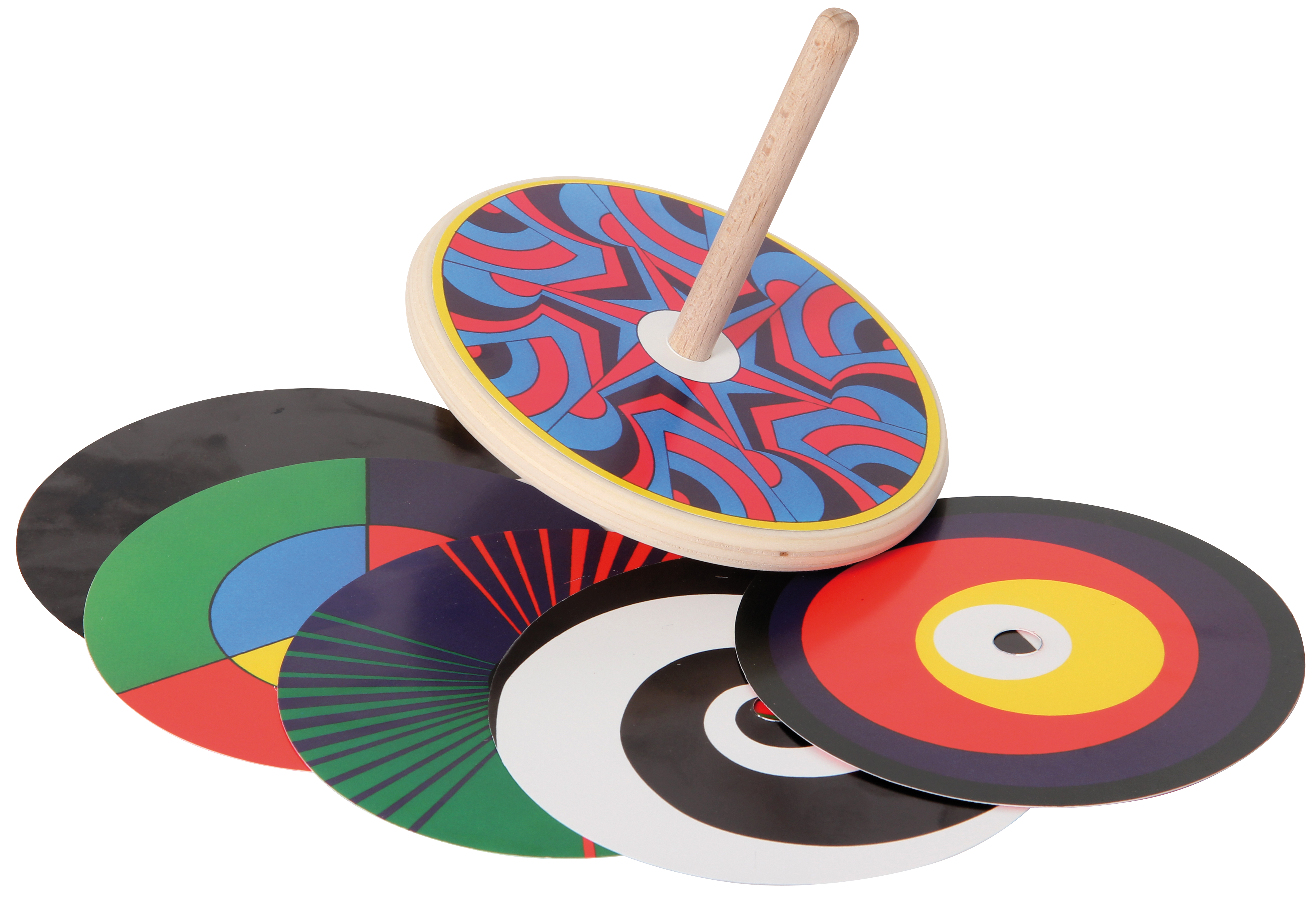 Sechs beidseitig bedruckte Pappscheiben lassen den Kreisel in zwölf Farb- und Mustervariationen auf dem Tisch tanzen.