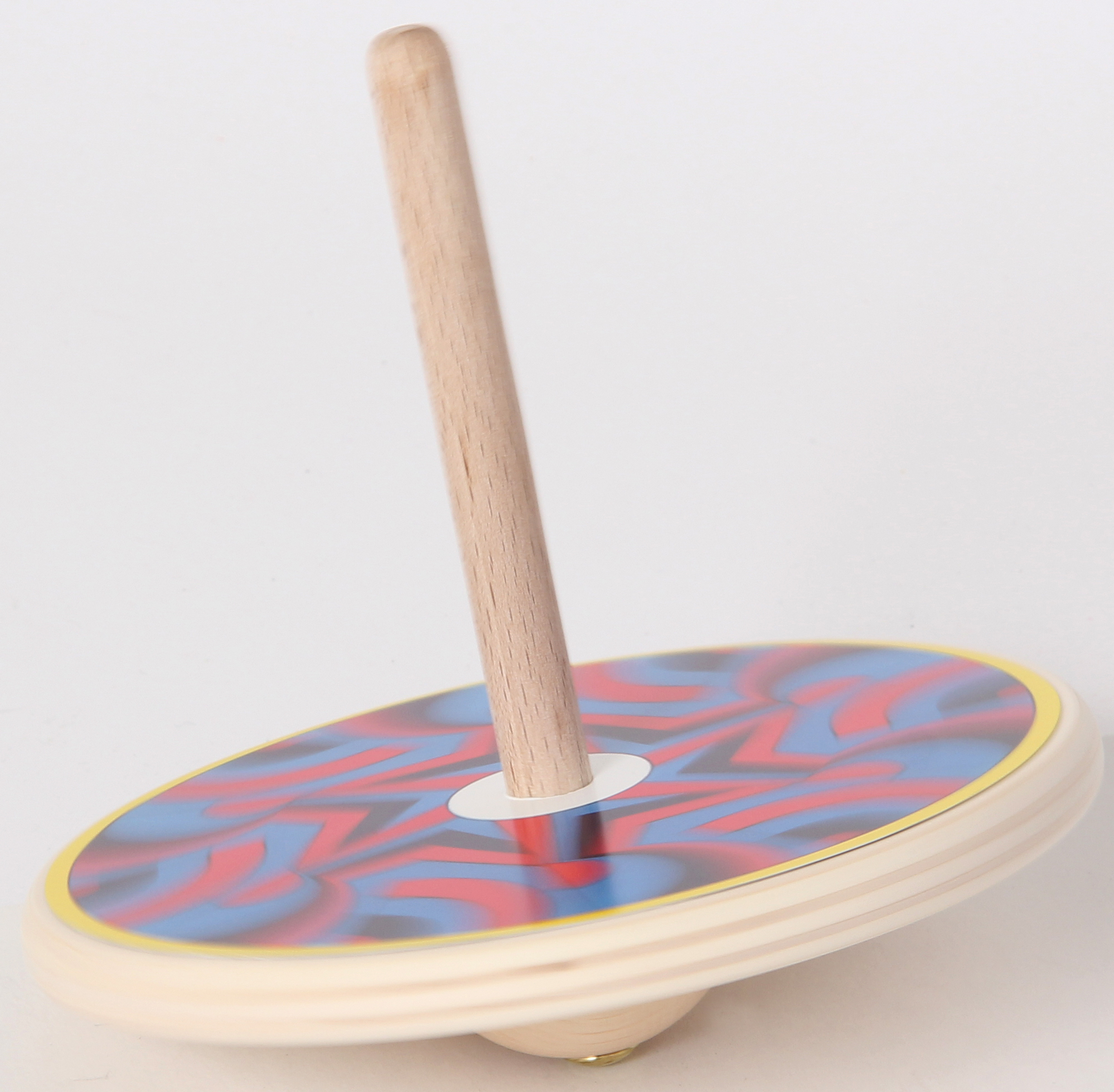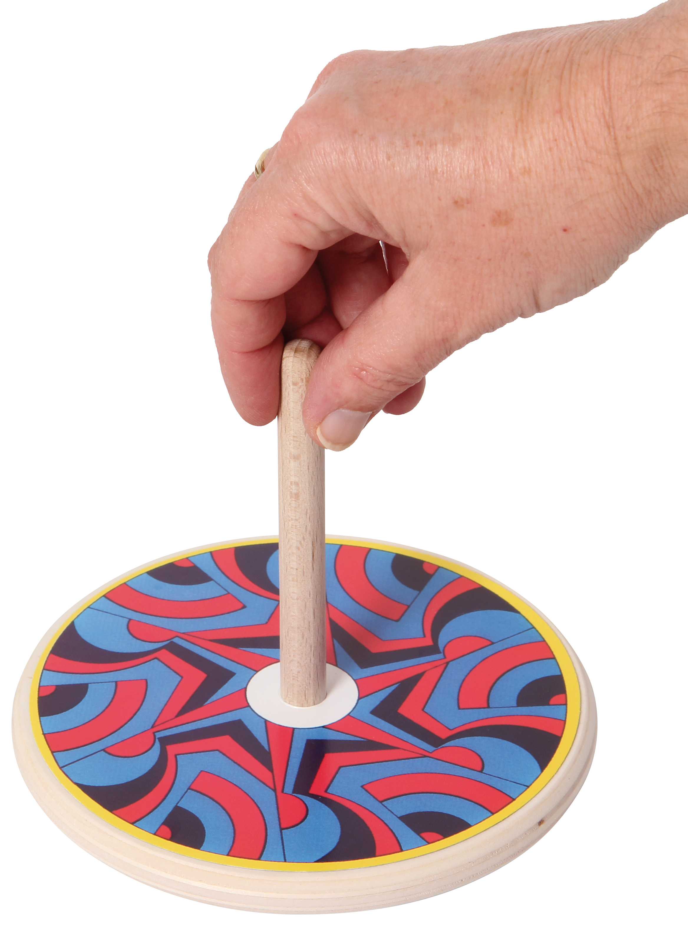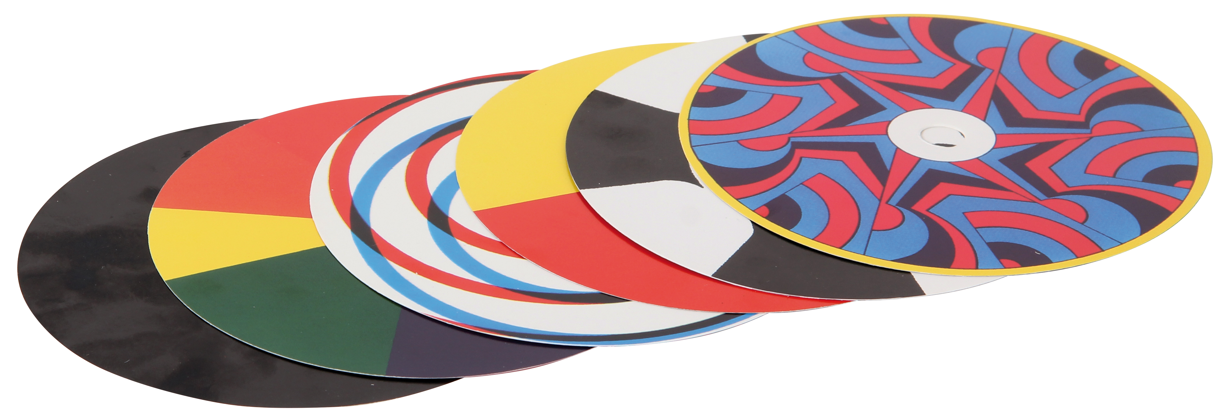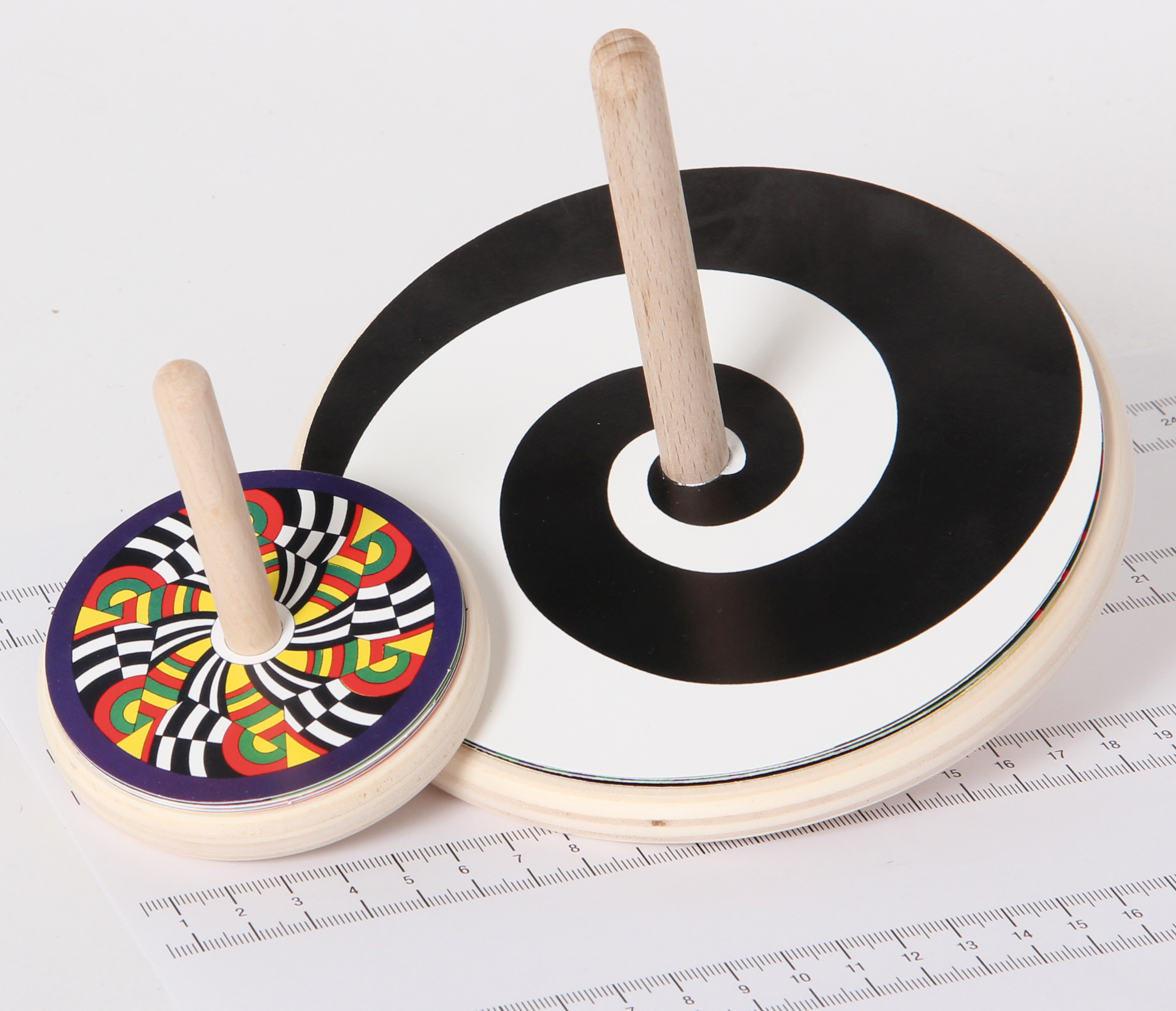 Sechs beidseitig bedruckte Pappscheiben lassen den Kreisel in zwölf Farb- und Mustervariationen auf dem Tisch tanzen.
