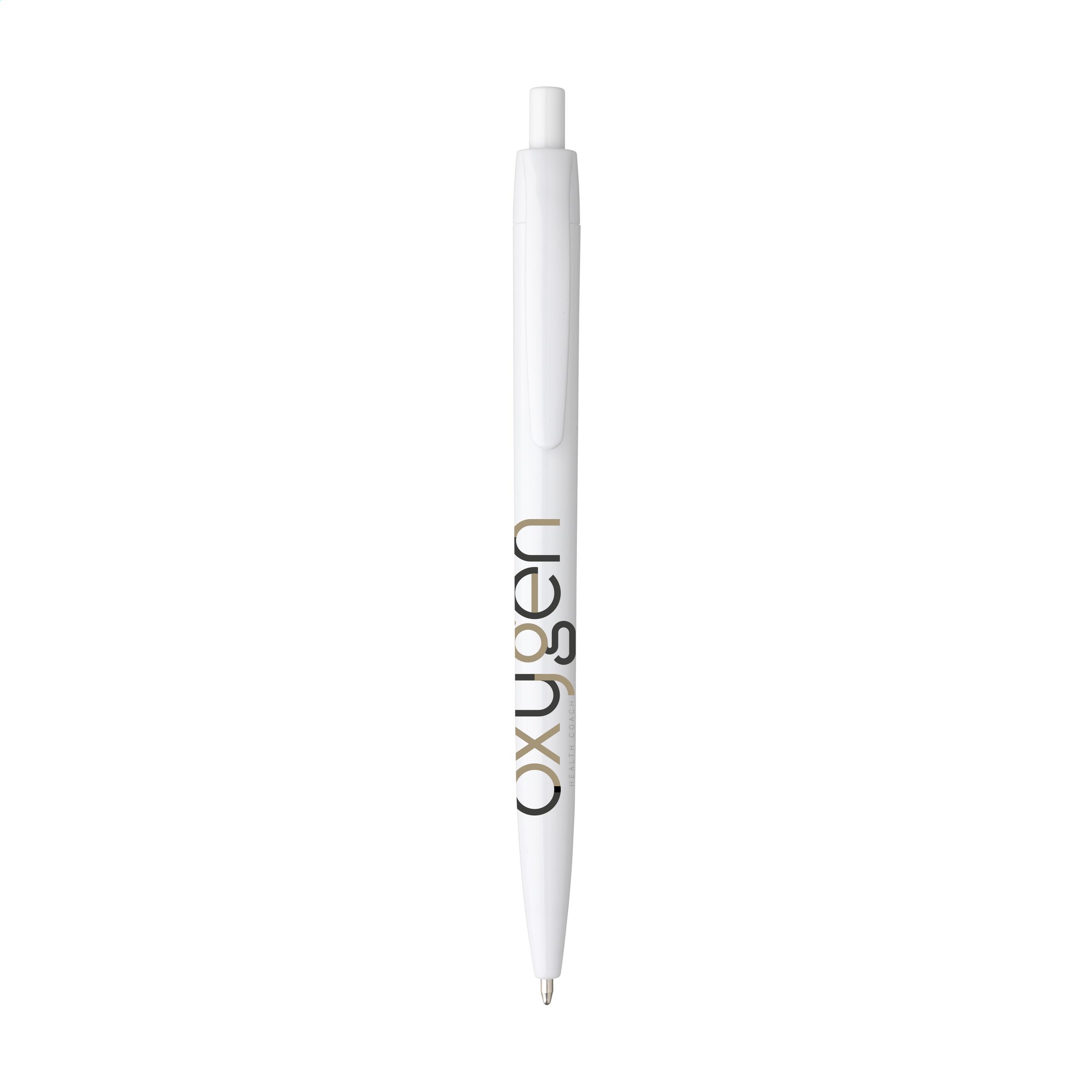Beschreibung: Blauschreibender Kugelschreiber mit weißem Halter aus einem Stück. Sehr gut geeignet für einen großzügigen Aufdruck. Auffälliges Detail: der farbige Clip.