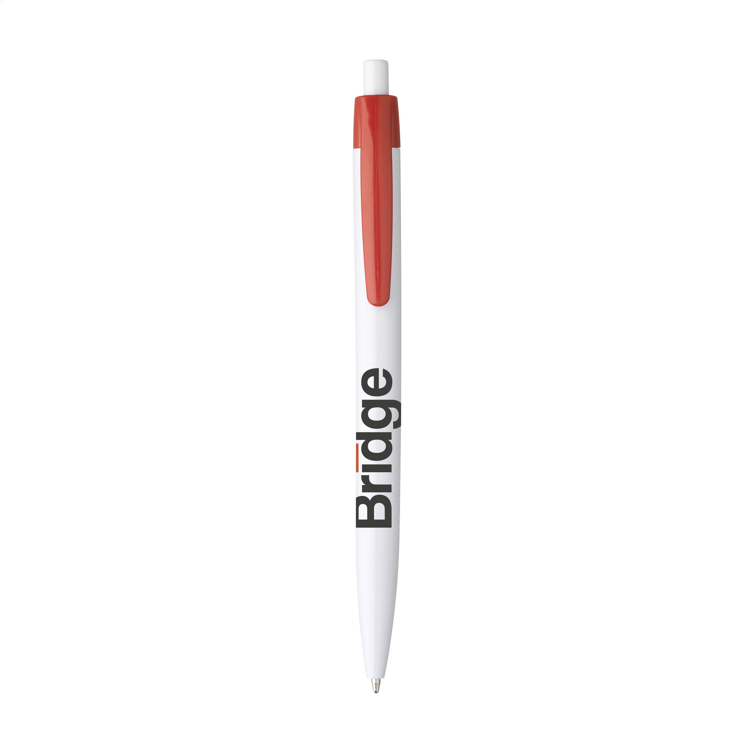 Beschreibung: Blauschreibender Kugelschreiber mit weißem Halter aus einem Stück. Sehr gut geeignet für einen großzügigen Aufdruck. Auffälliges Detail: der farbige Clip.