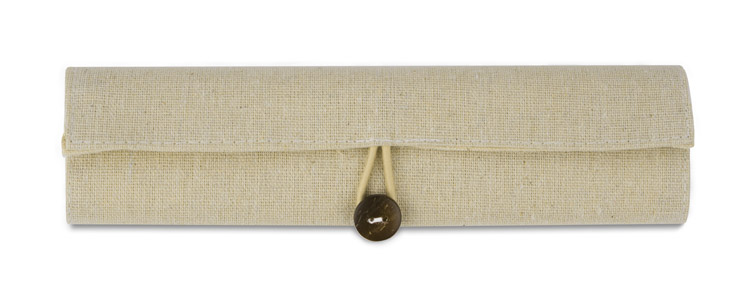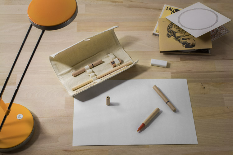 Öko-Federtasche mit Leinen. Knopfverschluss. Im Set 3 Kugelschreiber mit roter, blauer und schwarzer Schreibfarbe. Bleistift, Spitzer, Radiergummi, Lineal. Das Logo wird aufgedruckt.