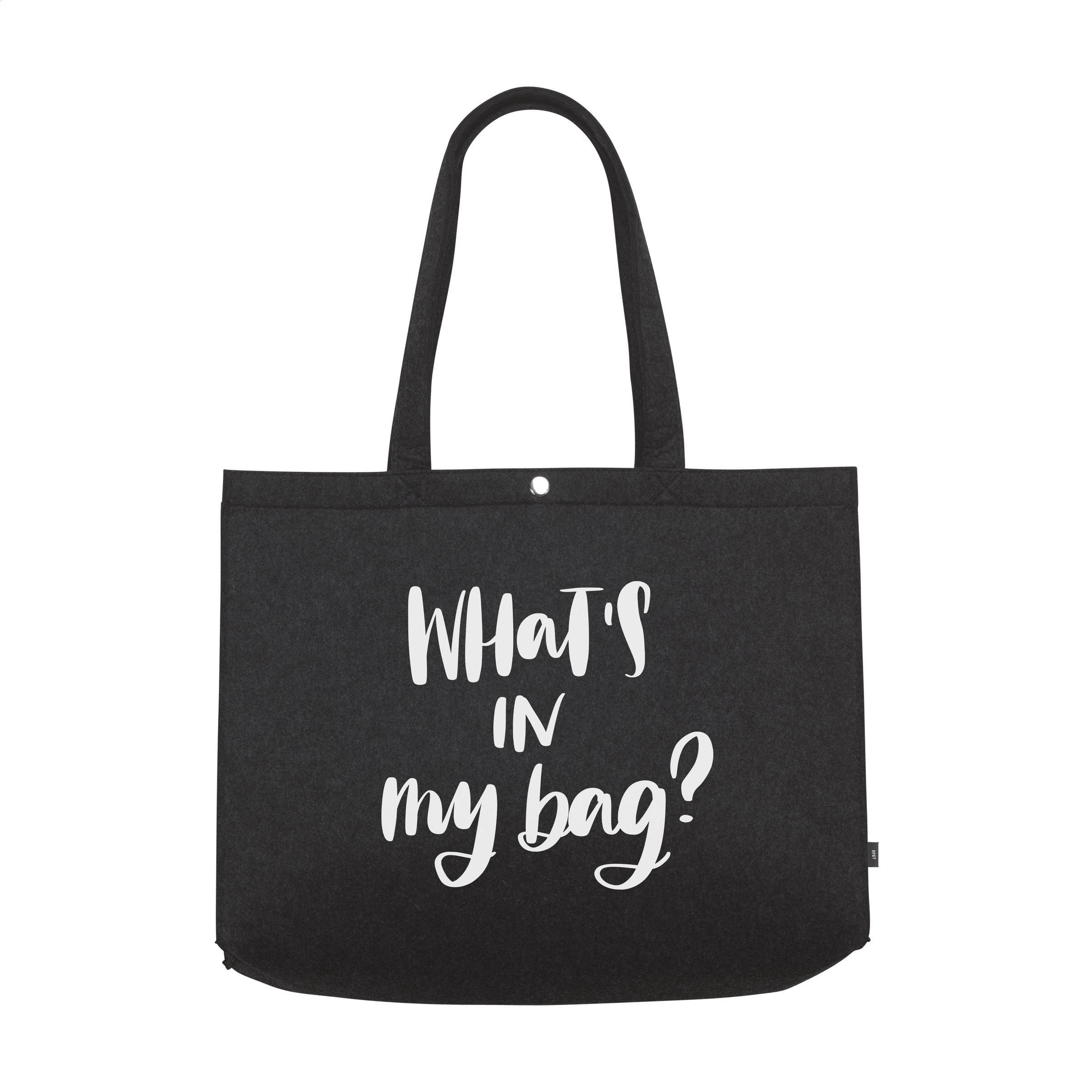 Coole, geräumige Einkaufstasche aus RPET-Filz. Diese Tasche bietet äußerst viel Platz und ist mit langen Griffen und einem Druckknopf ausgestattet. Das Material ist von hoher Qualität. GRS-zertifiziert. Gesamtes recyceltes Material: 95%. Fassungsvermögen ca. 20 Liter.
