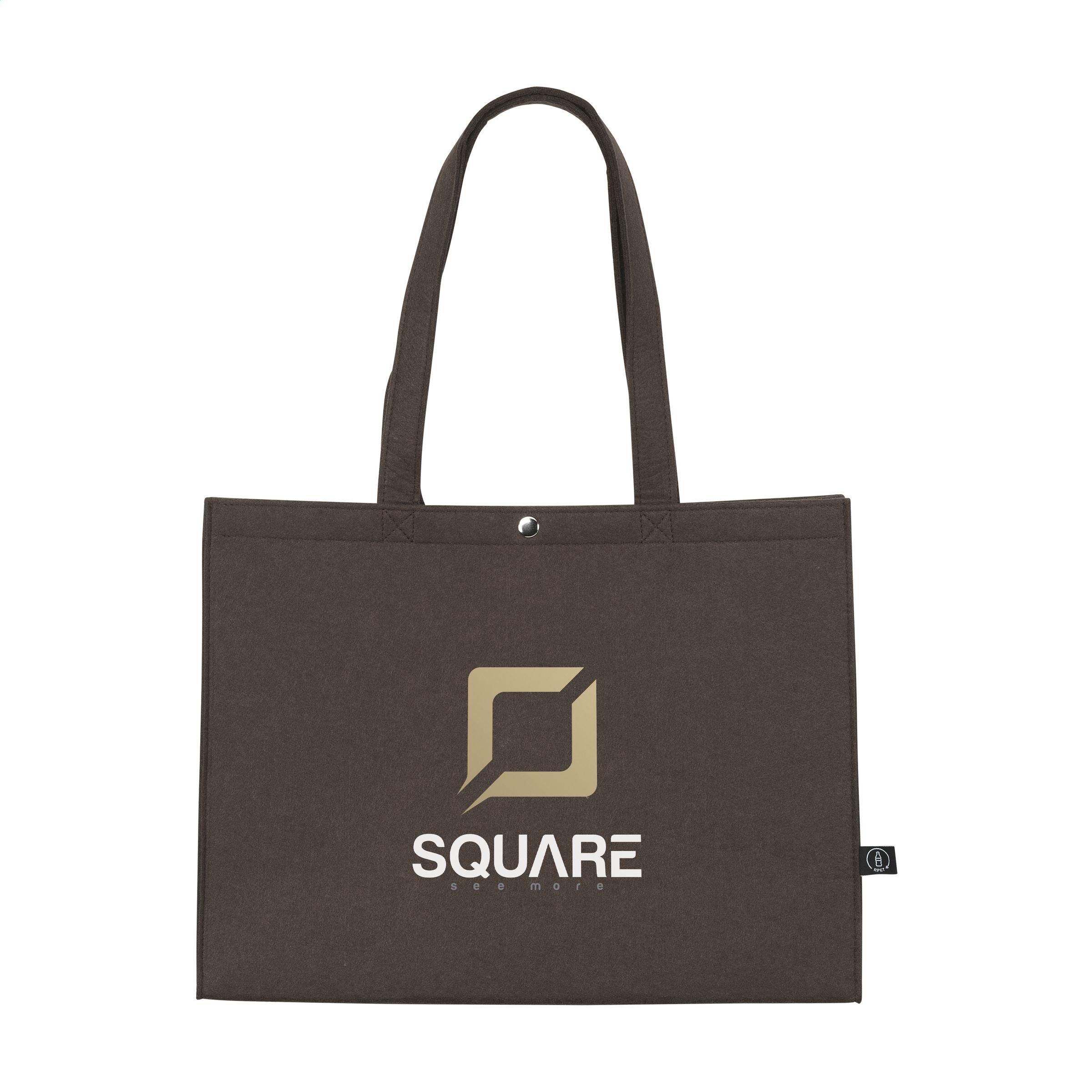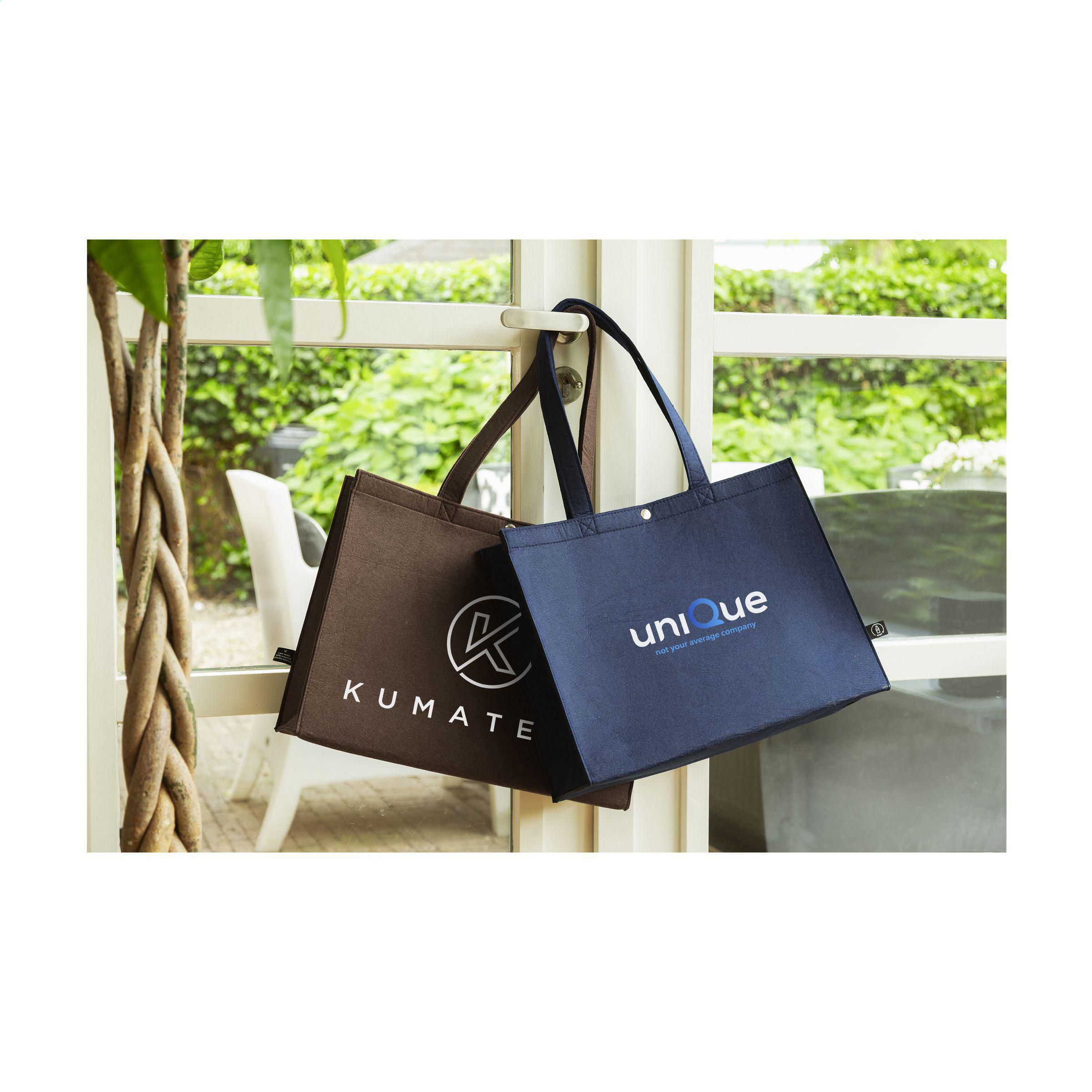 Coole, geräumige Einkaufstasche aus RPET-Filz. Diese Tasche bietet äußerst viel Platz und ist mit langen Griffen und einem Druckknopf ausgestattet. Das Material ist von hoher Qualität. GRS-zertifiziert. Gesamtes recyceltes Material: 95%. Fassungsvermögen ca. 20 Liter.