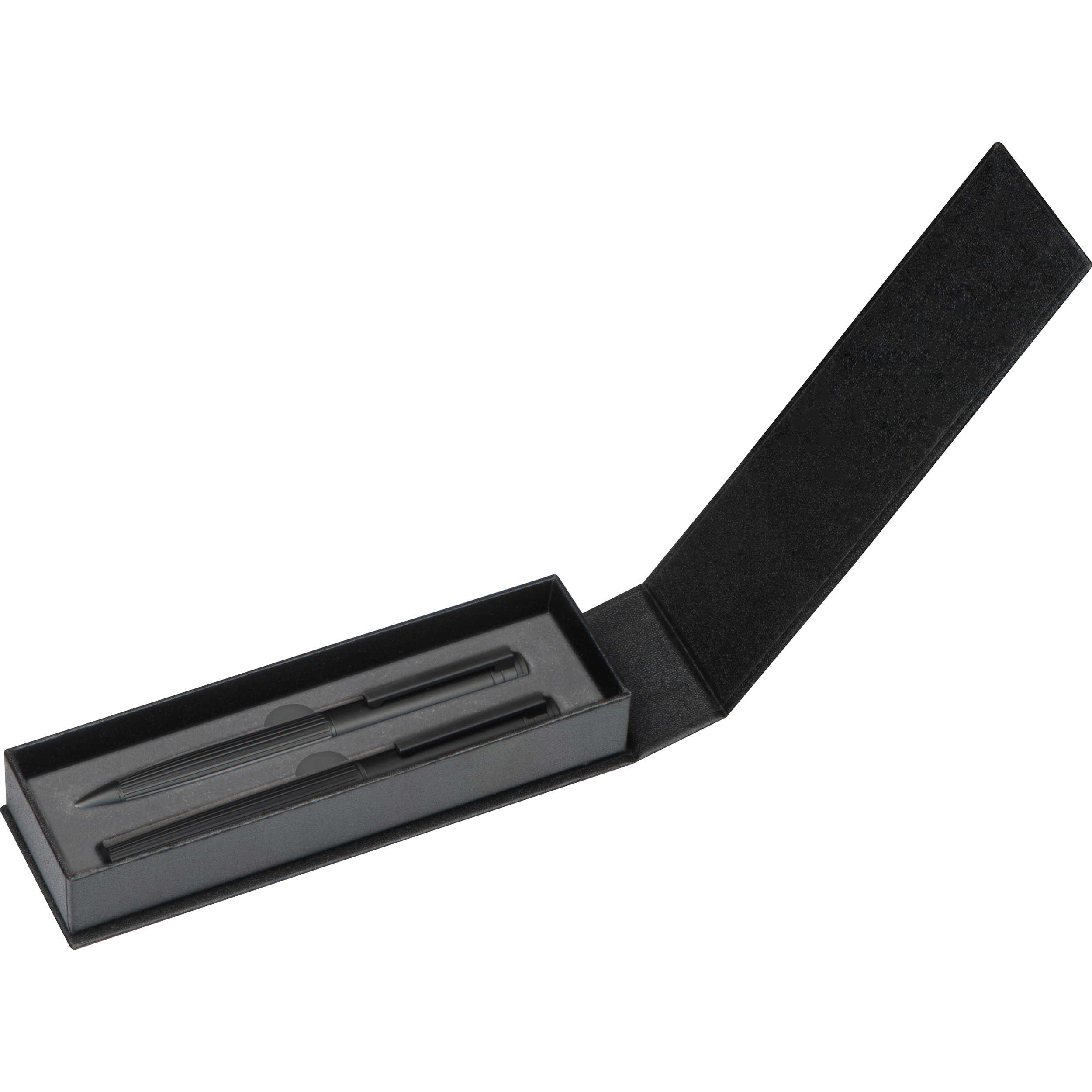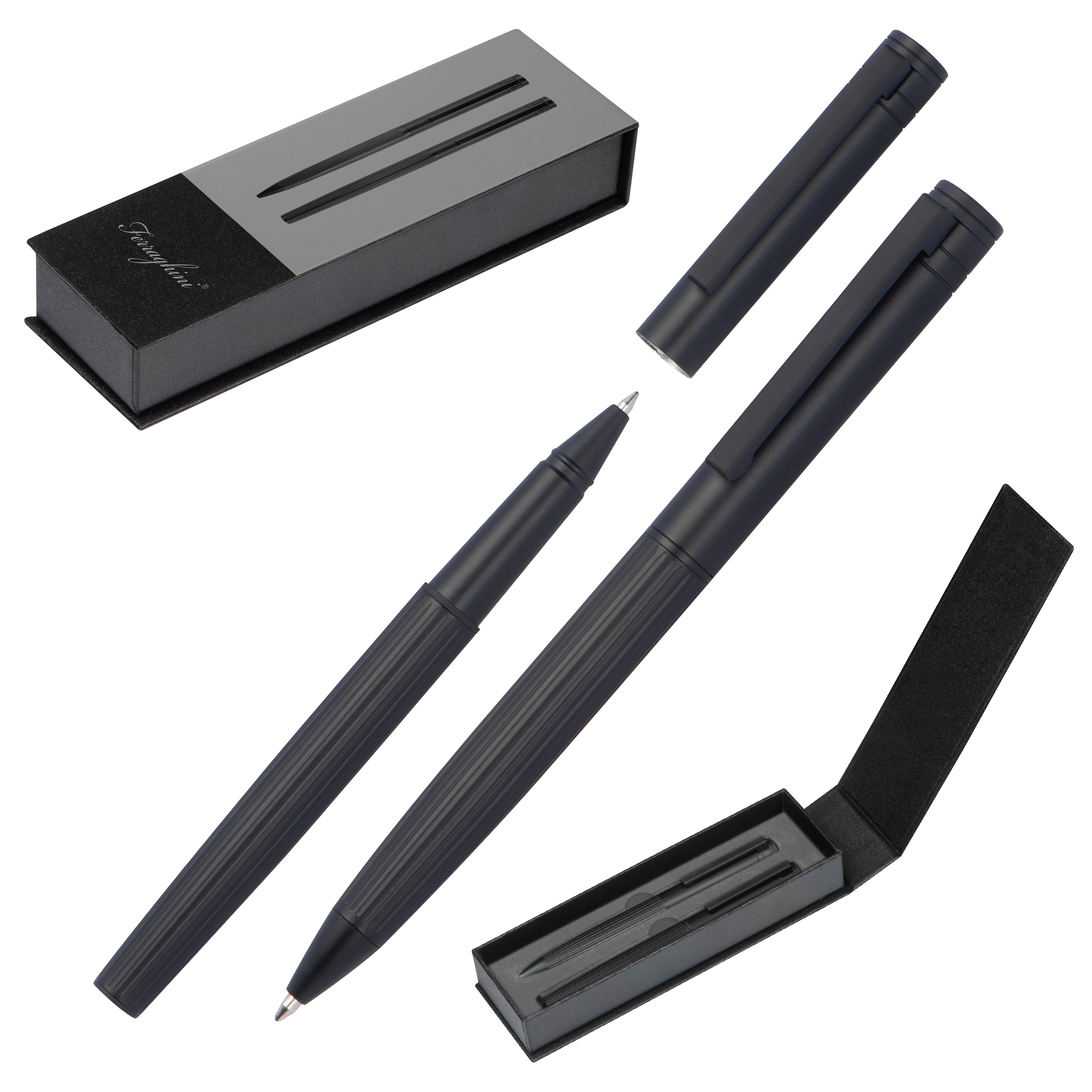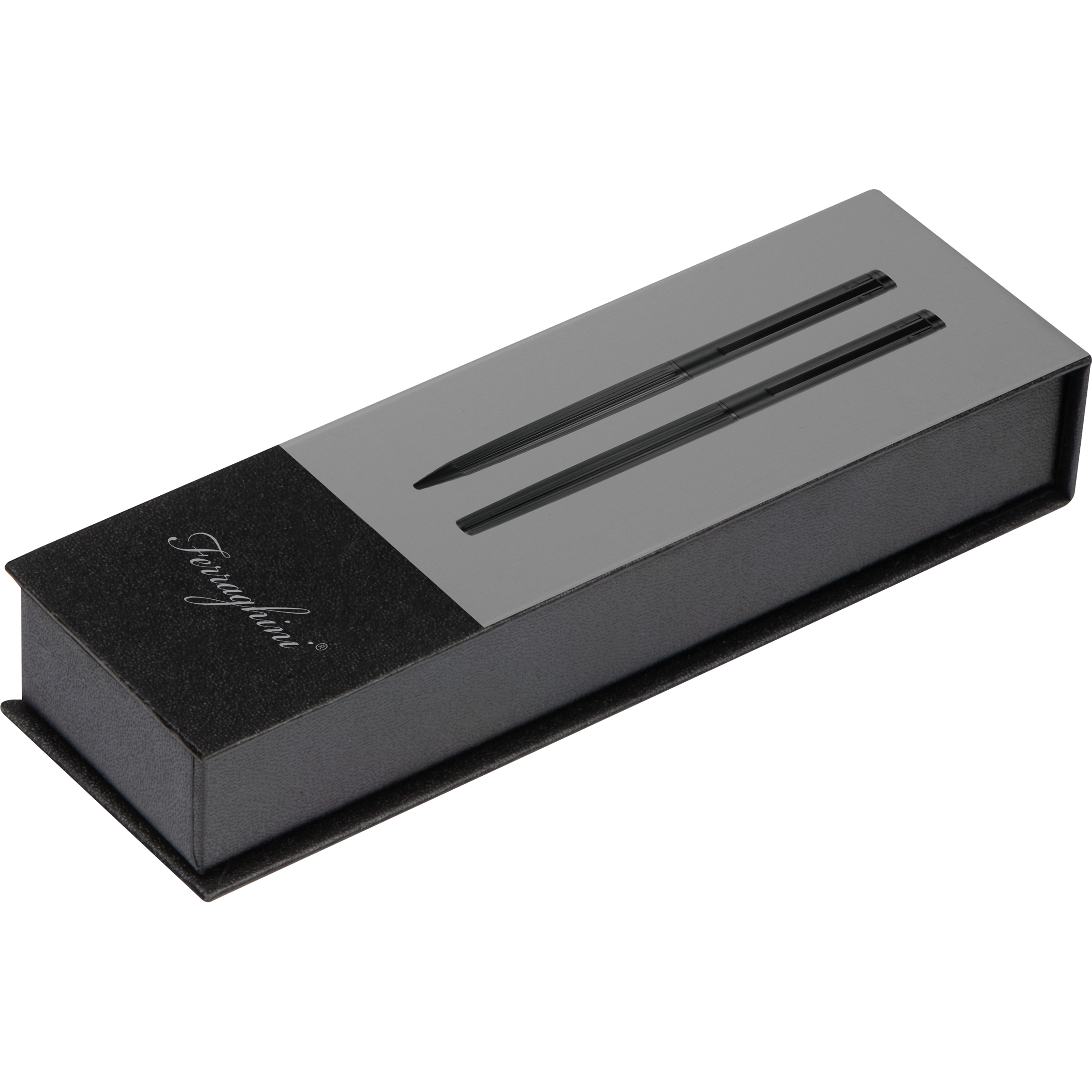 Ferraghini Schreibset bestehend aus einem Kugelschreiber und einem Rollerball (Schreibfarbe blau) aus Metall mit geriffelter Oberfläche. Ihre Werbung gravieren wir auf beide Schreibgeräte neben den Clip.