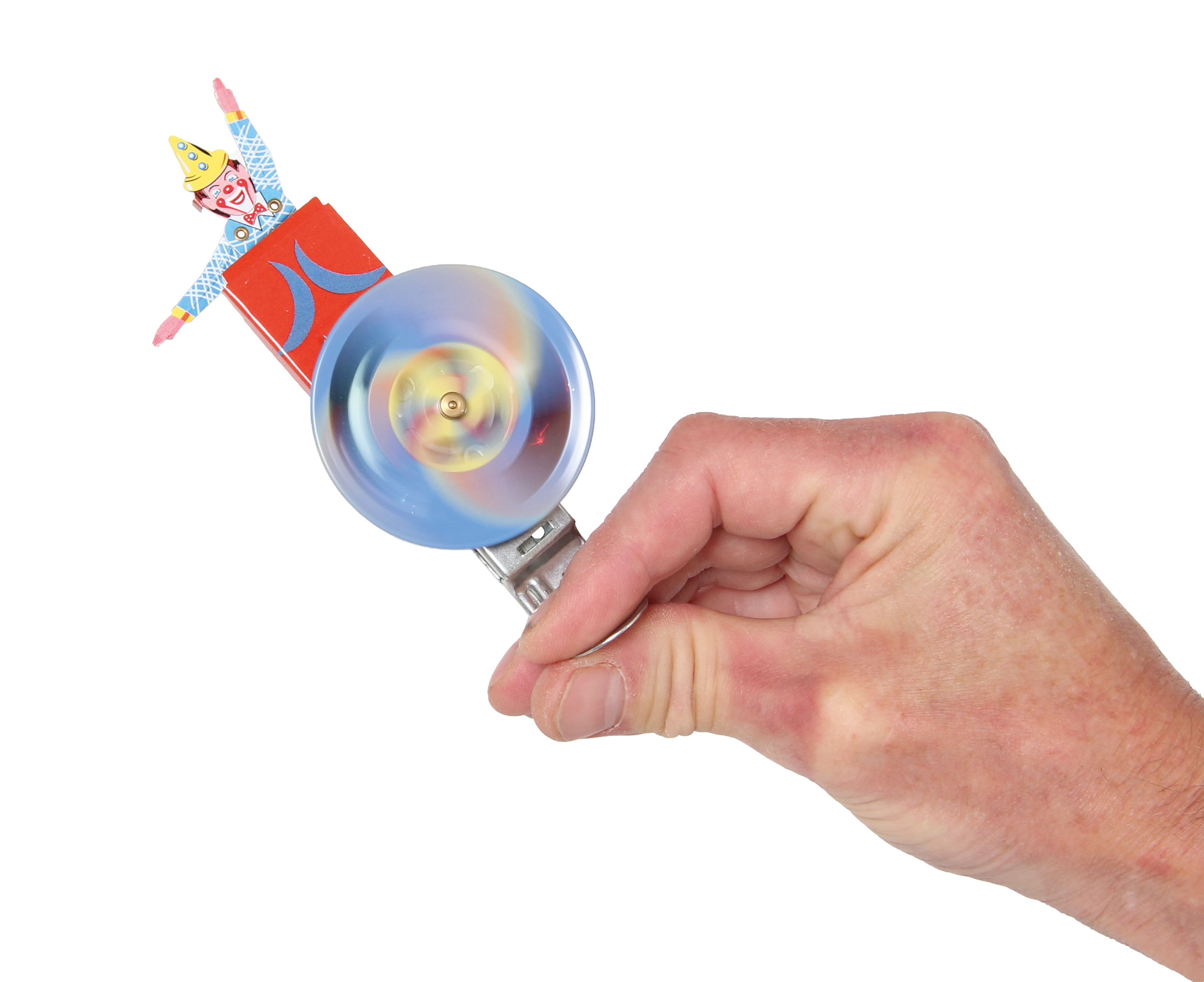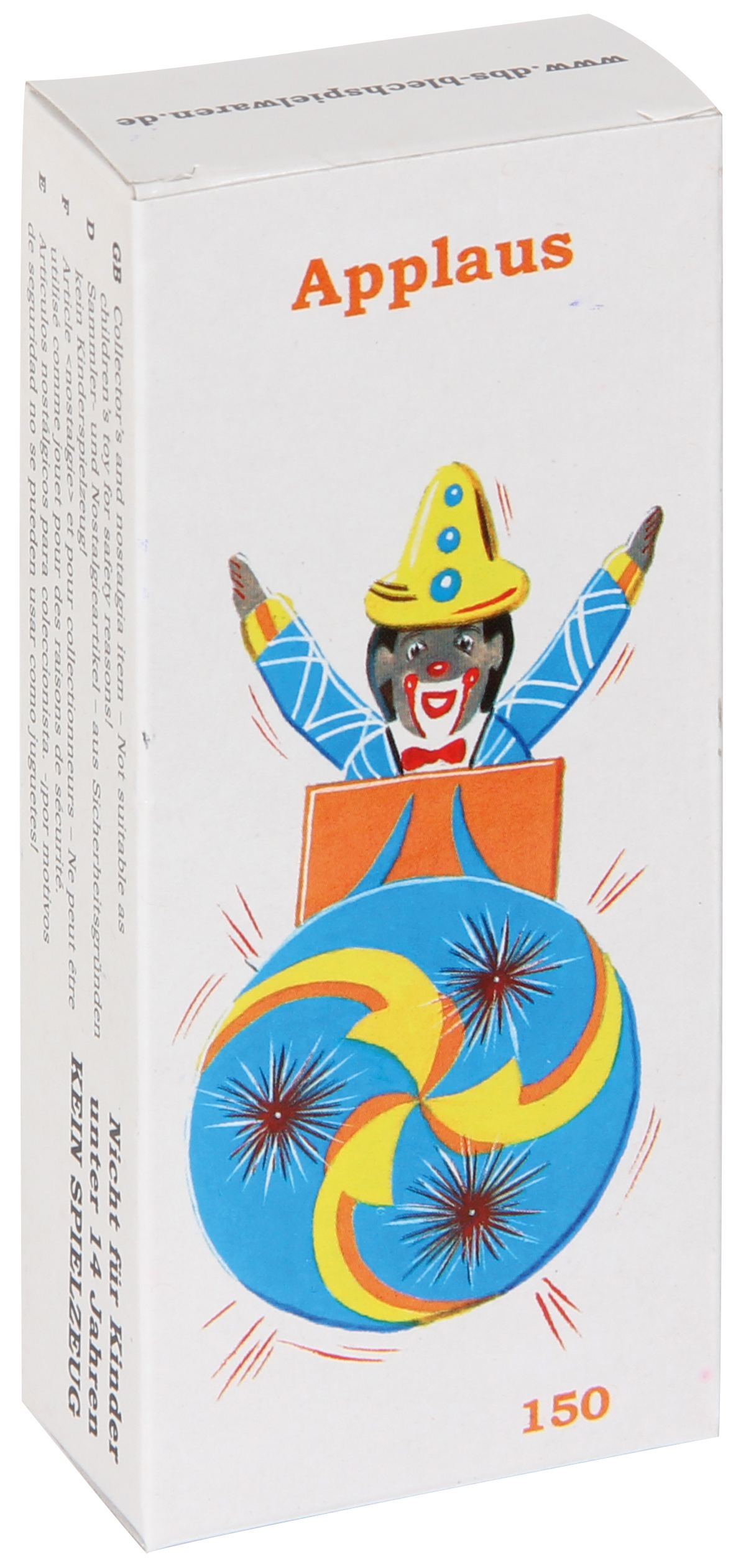 Origineller Sammler- und Nostalgieartikel aus Blech mit verblüffender Funktion: Drückt man den Stab, der Clown klatscht das Schwungrad dreht sich und es fliegen die Funken!