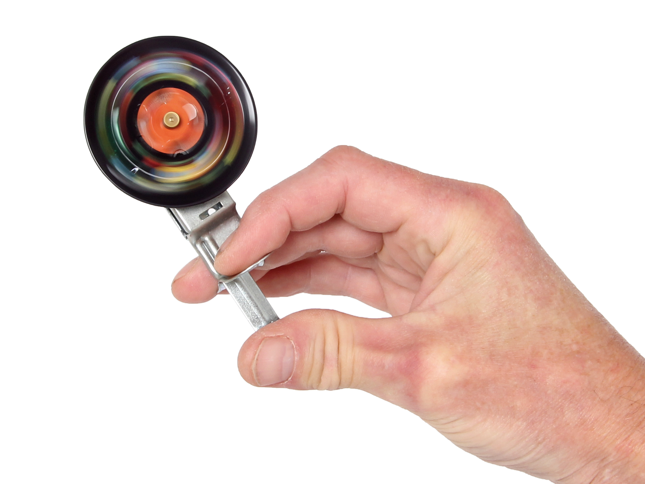 Origineller Sammler- und Nostalgieartikel aus Blech mit verblüffender Funktion: Drückt man den Stab, dreht sich das Schwungrad und es fliegen die Funken!