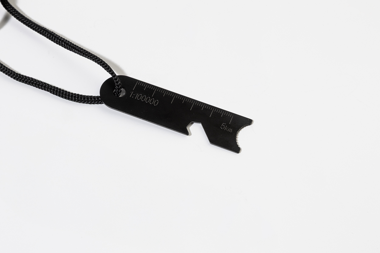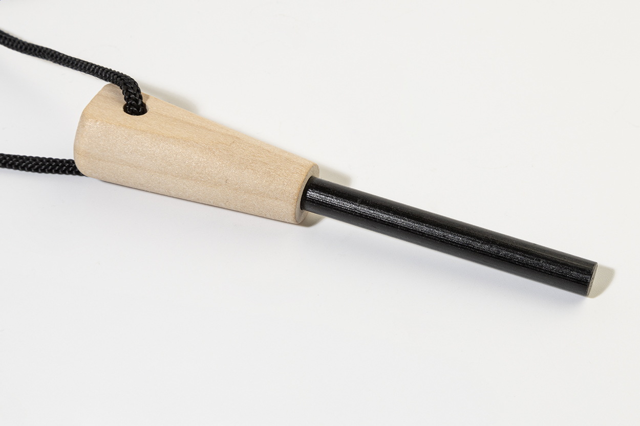 Überlebens-Feuerstarter-Werkzeug mit Holzgriff und multifunktionalem Edelstahlschaber, ausgestattet mit Lineal, Flaschenöffner und Inbusschlüssel.