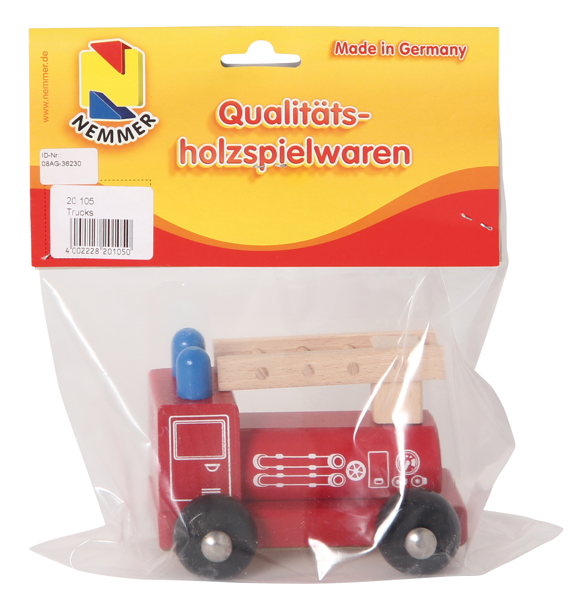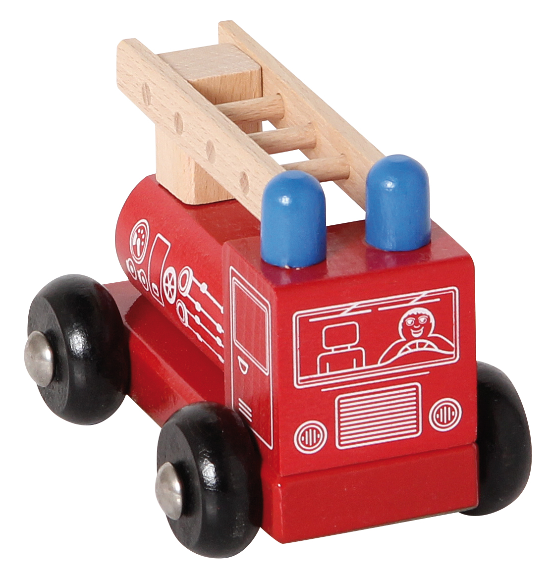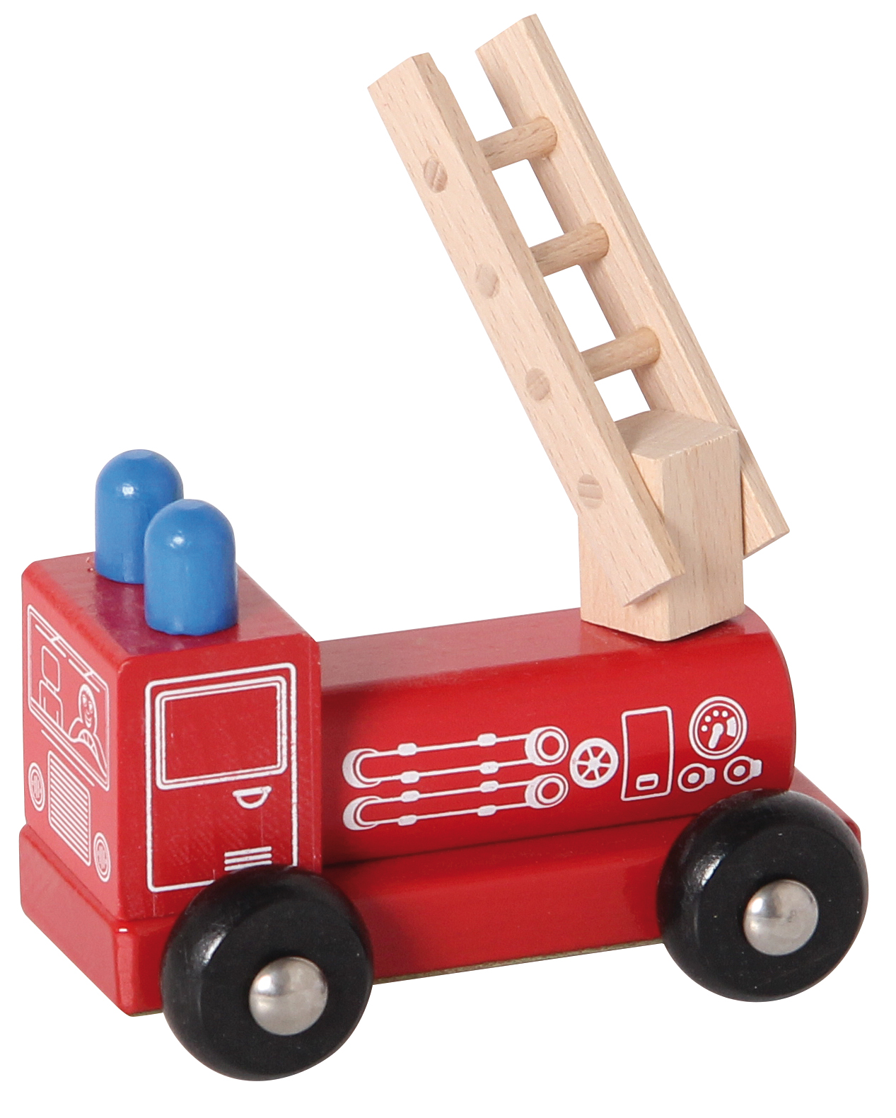 Feuerwehr-Flitzer aus massivem Holz mit Metallachsen und beweglicher, abnehmbarer Leiter. Made in Germany.