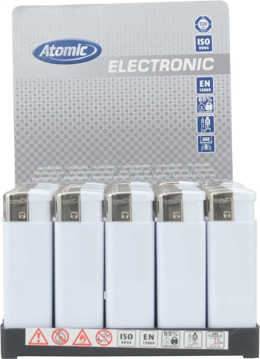 Wiederbefüllbares Kunststoff-Piezo-Feuerzeug mit Kindersicherung. Wird mit etwa 80 % Gasfüllung geliefert. Nur in vollen Exportkartonmengen erhältlich (Multiplikationen von 1.000 Stück)!