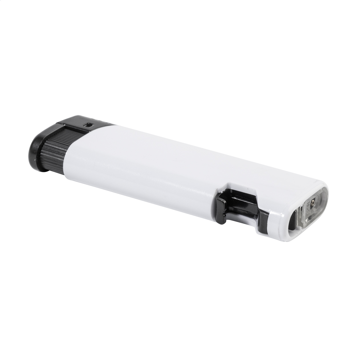 Nachfüllbares Piezo-Feuerzeug aus Kunststoff und Flaschenöffner. Mit Kindersicherung. Wird mit etwa 80 % Gasfüllung geliefert. Nur in vollen Exportkartonmengen erhältlich (Vielfaches von 500 Stück)!