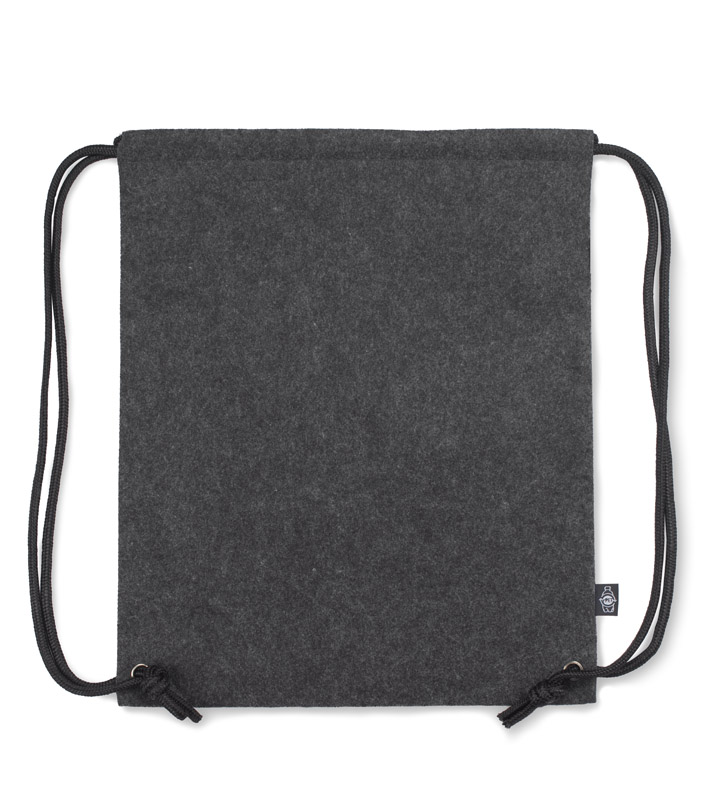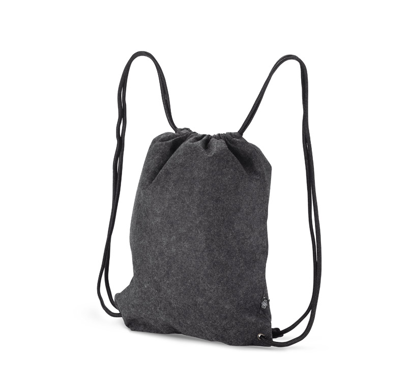 Tasche DENGY aus recyceltem rPET-Filz in einer neutralen Graphitfarbe. In Kombination mit schwarzen Schnüren und einem Griff sieht es äußerst interessant aus.