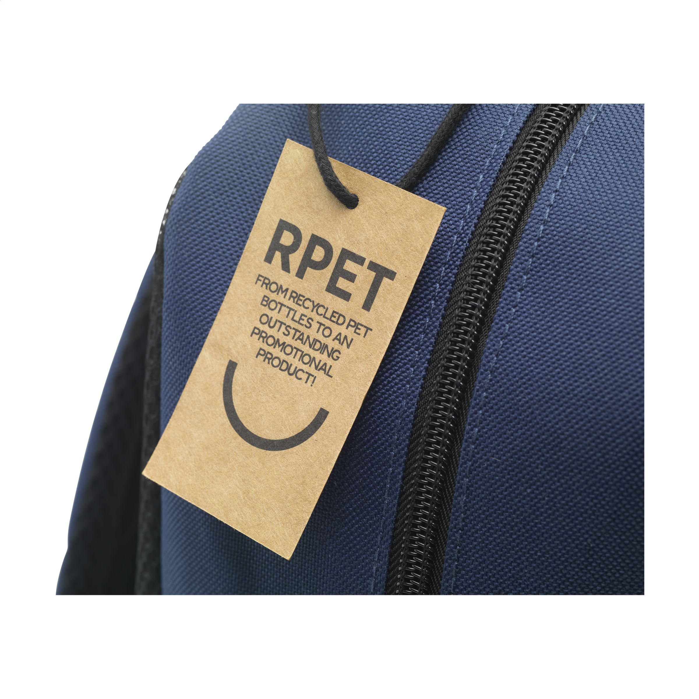 Rucksack aus robustem 600D RPET-Polyester. Mit einem großzügigen Fach mit stabilem Reißverschluss und einem mit schützendem Schaumstoff ausgestatteten Fach für den sicheren Transport eines Laptops bis zu 15,6 Zoll. Mit einem zusätzlichen Reißverschlussfach auf der Vorderseite und einer praktischen Trageschlaufe. Für zusätzlichen Tragekomfort sind die verstellbaren Schulterriemen und die Rückseite mit Schaumstoff ausgestattet. Die Rückseite ist mit Mesh-Gewebe gefertigt. GRS-zertifiziert. Recyceltes Material insgesamt: 98%. Fassungsvermögen ca. 15 Liter.