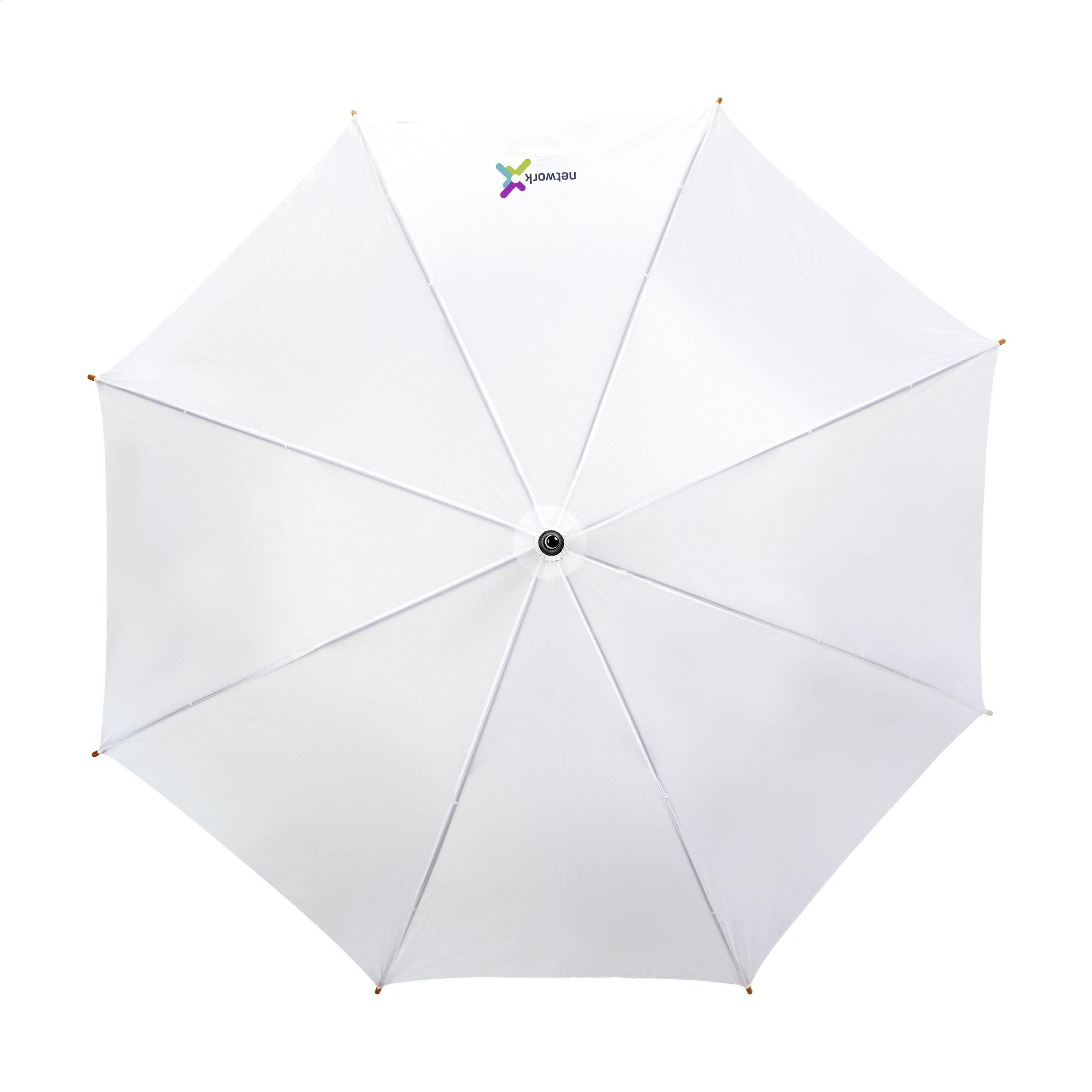 Regenschirm mit automatischer Teleskopöffnung, 190T RPET Pongee-Bespannung, Metallgestell, Holzschaft und -griff sowie einem Klettverschluss. RCS-zertifiziert. Recyceltes Material insgesamt: 15%