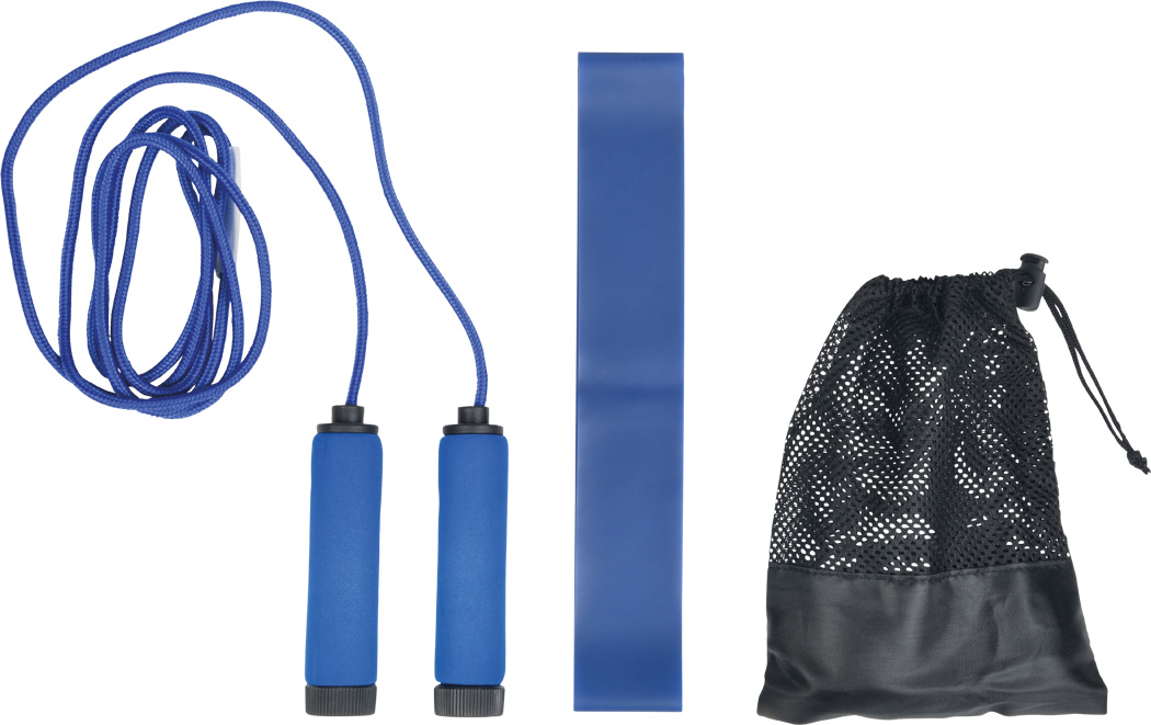 Fitness-Set STRETCH & JUMP: in der Länge verstellbares Springseil (max. 260 cm inkl. Griffe) und Fitnessband zur Stärkung der Muskulatur (Umfang 60 cm, Wiederstand ca. 6,8 kg), in schwarzem Netzbeutel