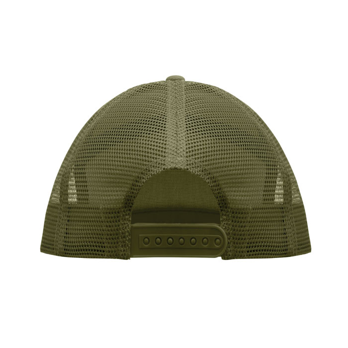 Kappe mit flachem Schirm. 7 Panels. Baumwoll-Twill 235 g / m² mit Polyester-Mesh-Rückseite und Kunststoffverschluss.