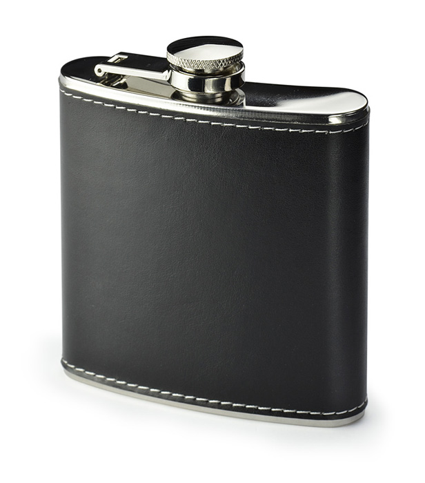 Stilvolle Banff-Flasche mit einem Fassungsvermögen von 6 oz (ca. 180 ml) aus rostfreiem Stahl und mit lederähnlichem Material (PU) versehen. Wir gravieren Ihr Logo per Laser auf den Flachmann.