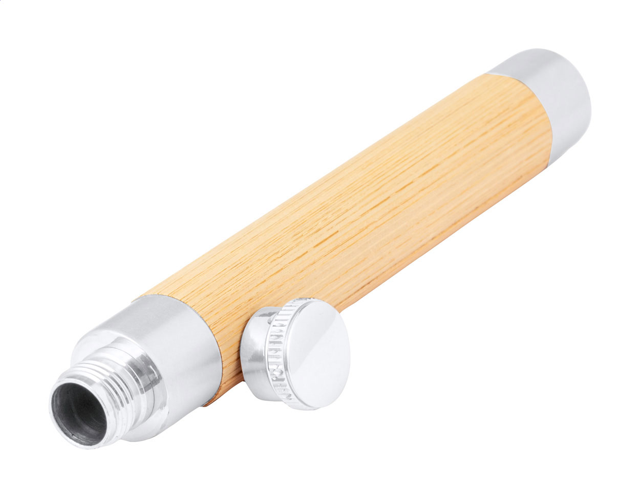 Flachmann aus Edelstahl mit Bambusmantel. Füllmenge: 45 ml.