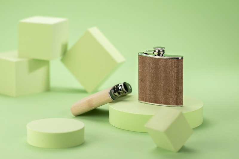 Flachmann 200ml mit Sicherheitsverschluss. Mit einer sehr dünnen Schicht aus natürlichem Bambus veredelt.