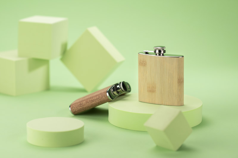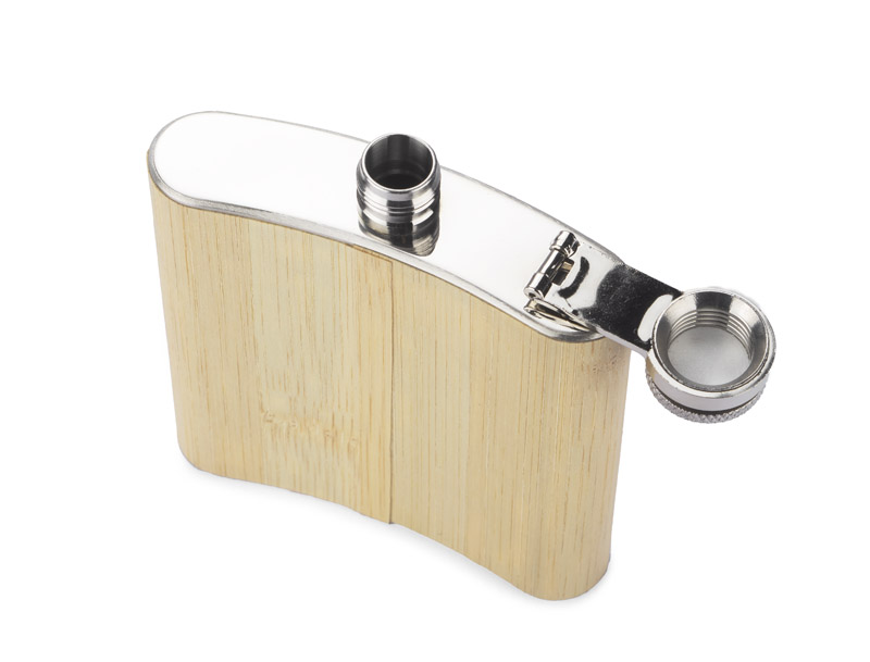 Flachmann 200ml mit Sicherheitsverschluss. Mit einer sehr dünnen Schicht aus natürlichem Bambus veredelt.