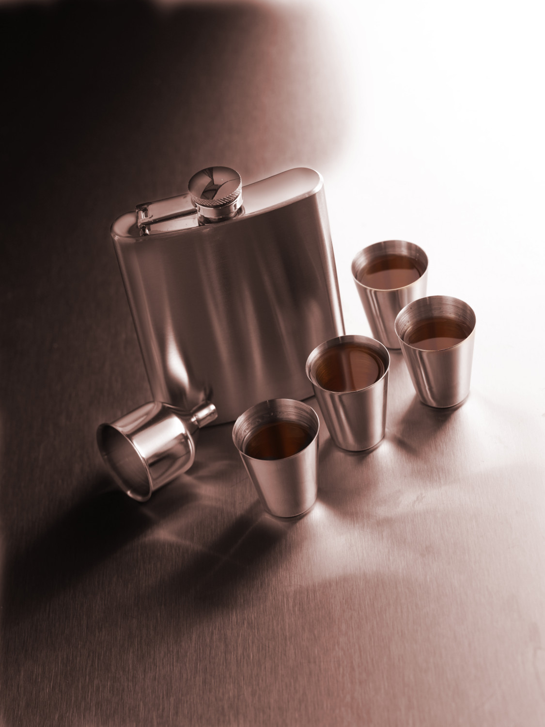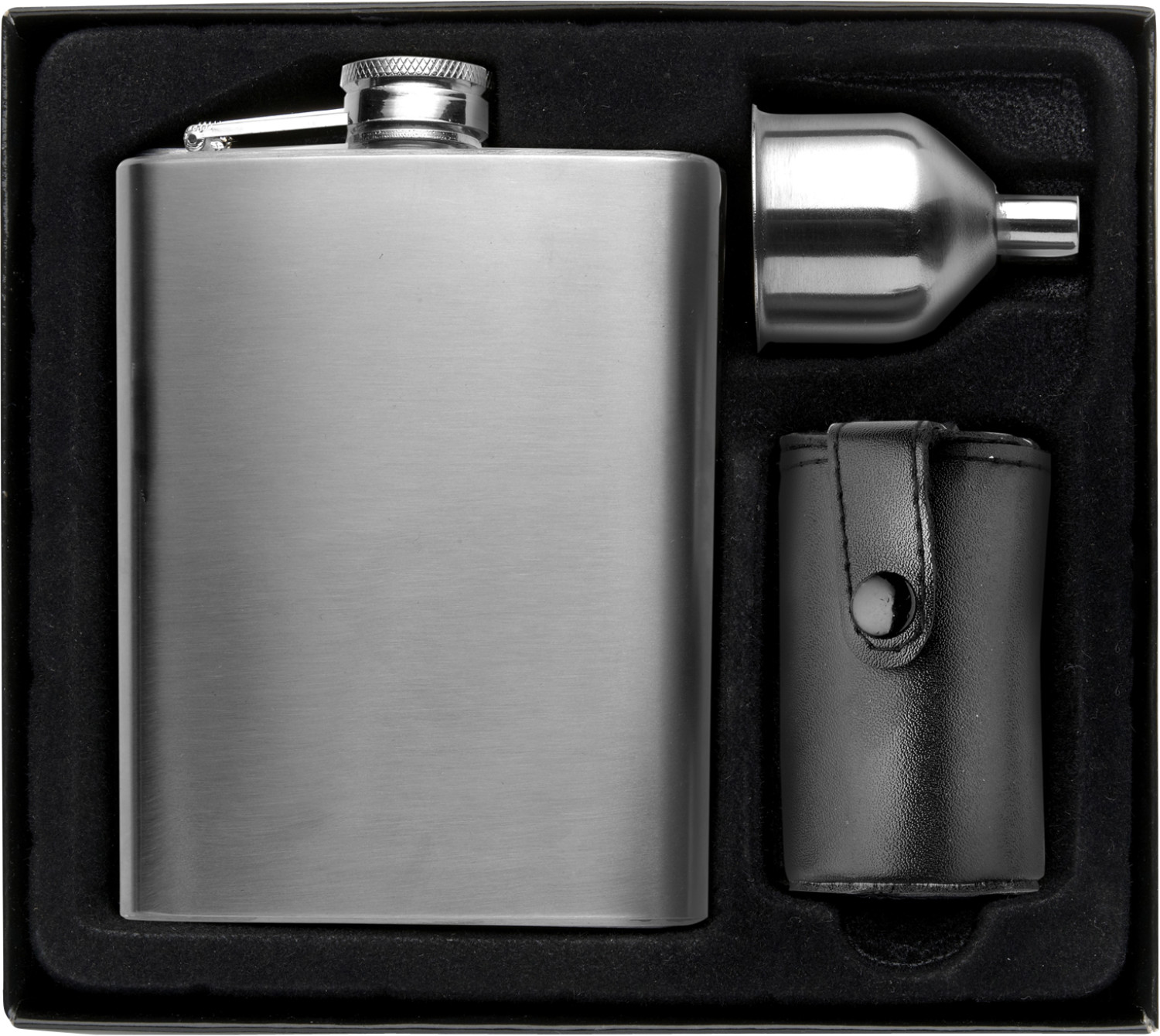 Flachmann Set aus Edelstahl, 6-tlg., bestehend aus einem Flachmann (220 ml), 4 Bechern (à 30 ml) und einem Trichter.