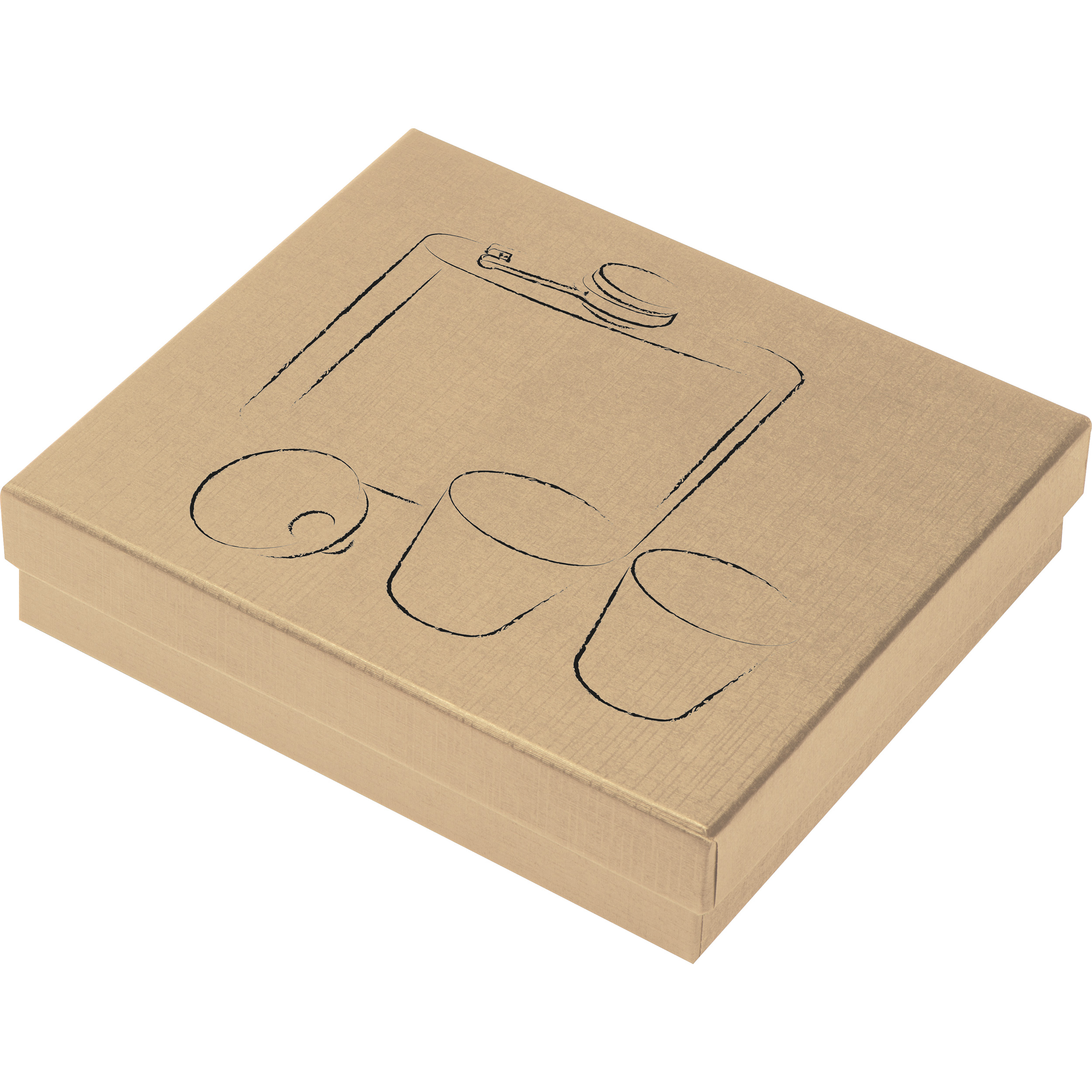Set bestehend aus einem Flachmann (178ml) , 2 Pinnchen (je 45ml) und einem Trichter aus Edelstahl. Ihre Werbung wird auf den Flachmann gelasert, Lasergravur auf die Pinnchen auf Anfrage.