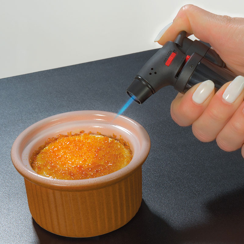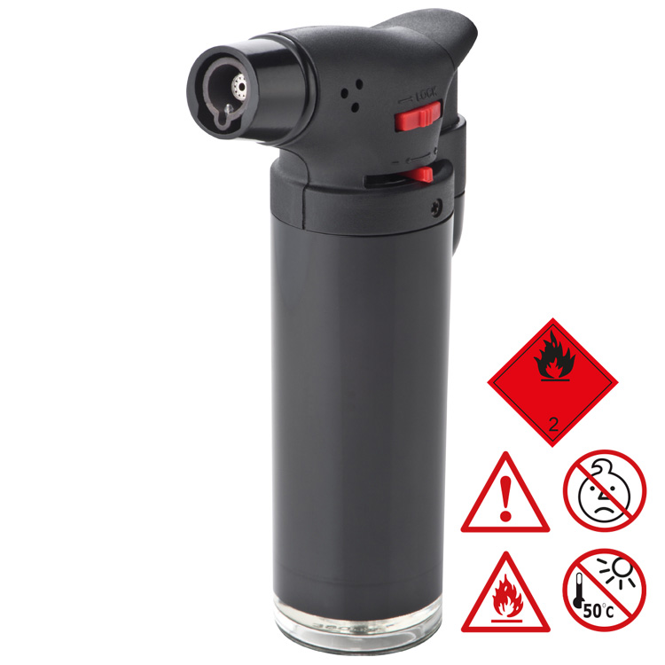 Nachfüllbarer, elektronischer Flambierbrenner mit regulierbarer Flammeneinstellung und Sicherung. Die Werbung wird auf den Schaft gedruckt.