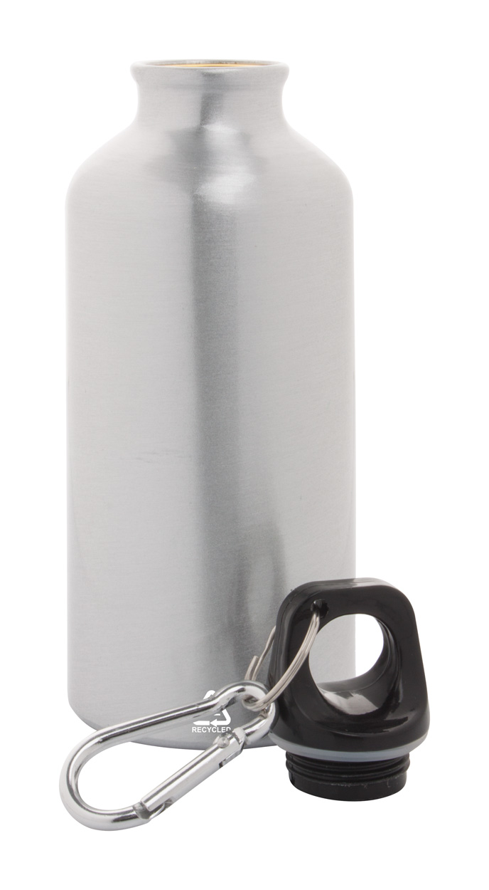 Trinkflasche aus recyceltem Aluminium mit Karabiner aus recyceltem Aluminium. Füllmenge: 400 ml.