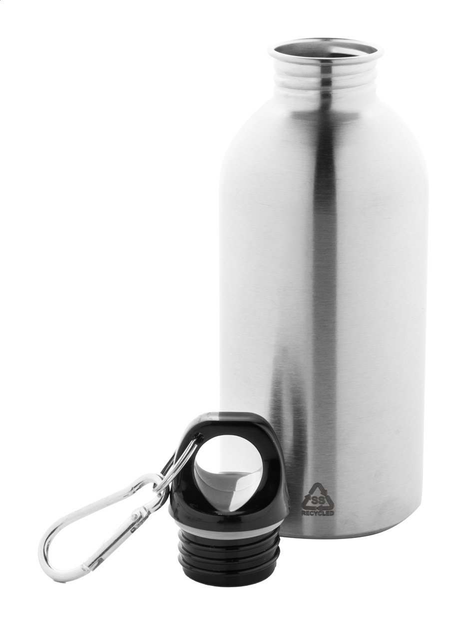 Recycelte Edelstahlflasche mit Aluminiumkarabiner. Füllmenge: 400 ml.