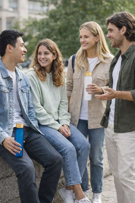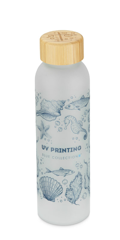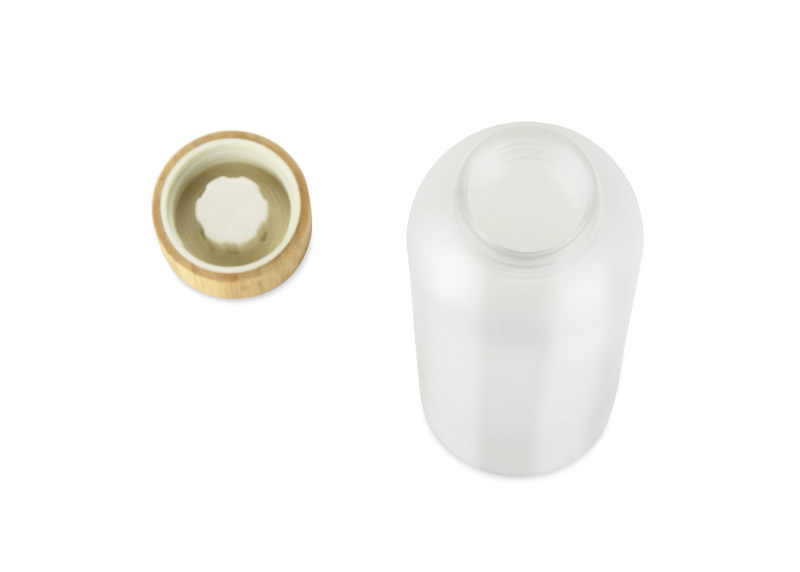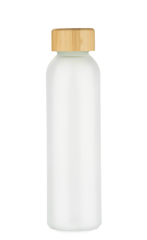 Die 500-ml-Flasche NILLO ist aus gefrostetem Recyclingglas hergestellt. Die halbtransparente Oberfläche und der Bambusverschluss verleihen dem Gesamtdesign einen modernen, zurückhaltenden Look. Der klassische Schraubverschluss sorgt für einen dichten Verschluss und die schlichte Form macht die Flasche praktisch für den täglichen Gebrauch. Sie eignet sich perfekt für die Aufbewahrung von Wasser, Säften oder Infusionen. Sie ist ein elegantes, wiederverwendbares Gadget mit der Möglichkeit der Beschriftung.