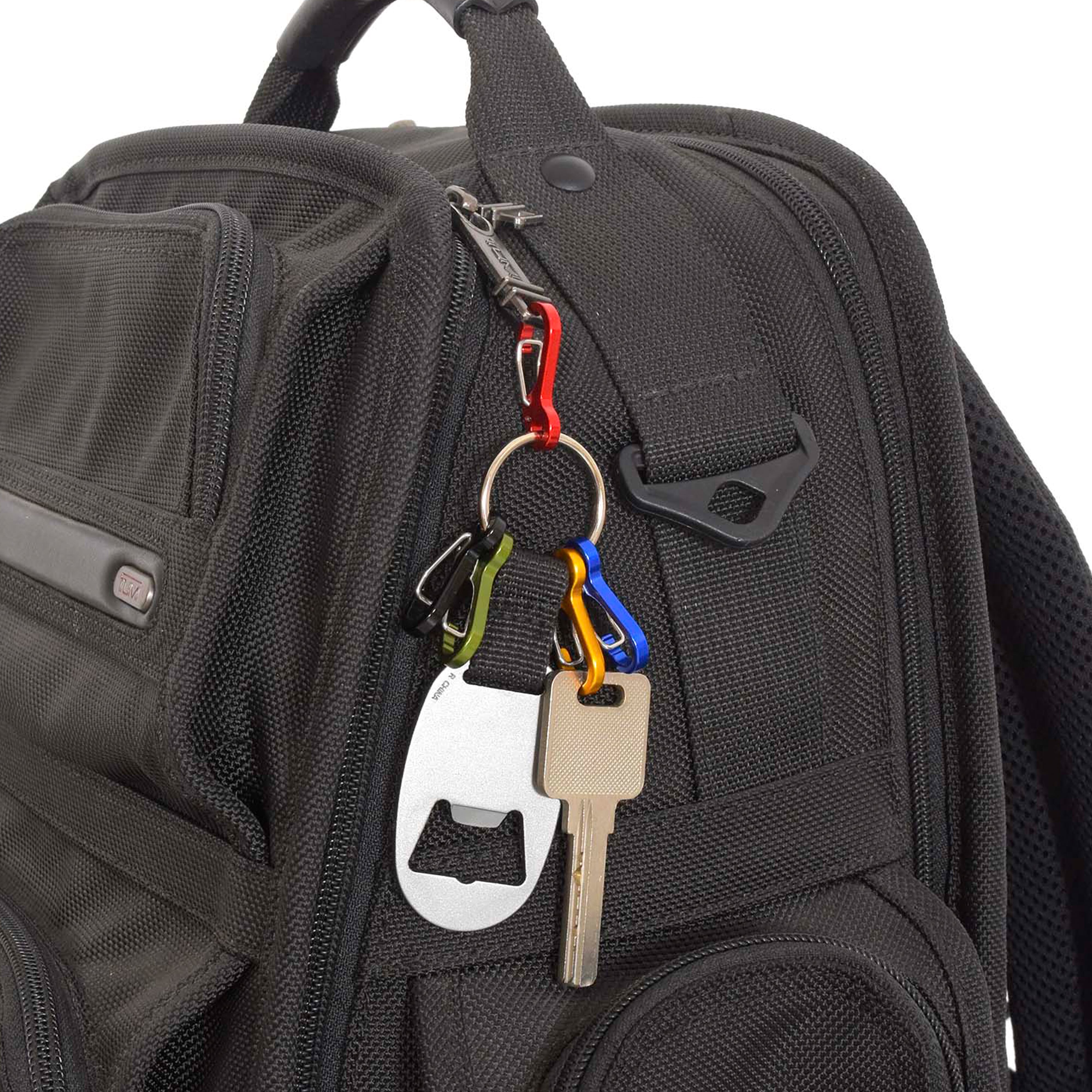 Flaschenöffner-Schlüsselanhänger aus recyceltem Aluminium mit 5 kleinen Karabinerhaken zur Organisation Ihrer Schlüssel. Ein praktisches und umweltfreundliches Accessoire für den täglichen Gebrauch.
