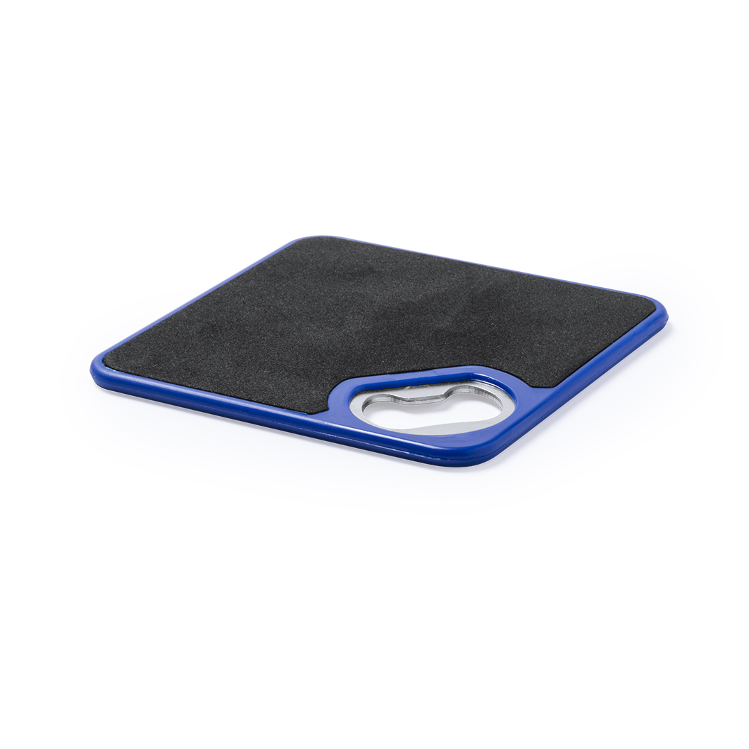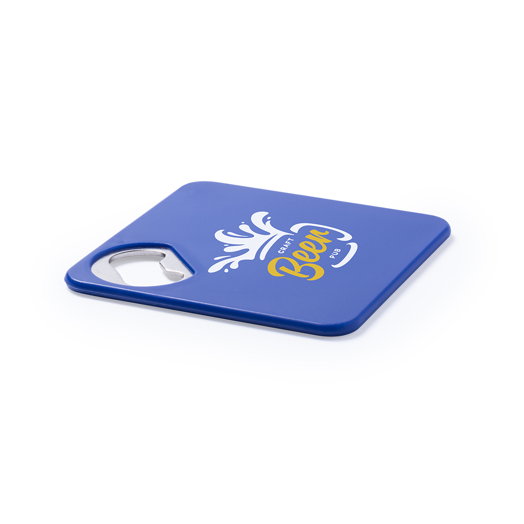 Origineller Untersetzer mit integriertem Metall-Flaschenöffner in einer Vielzahl von lebendigen Farben. Mit rutschfester Unterseite.