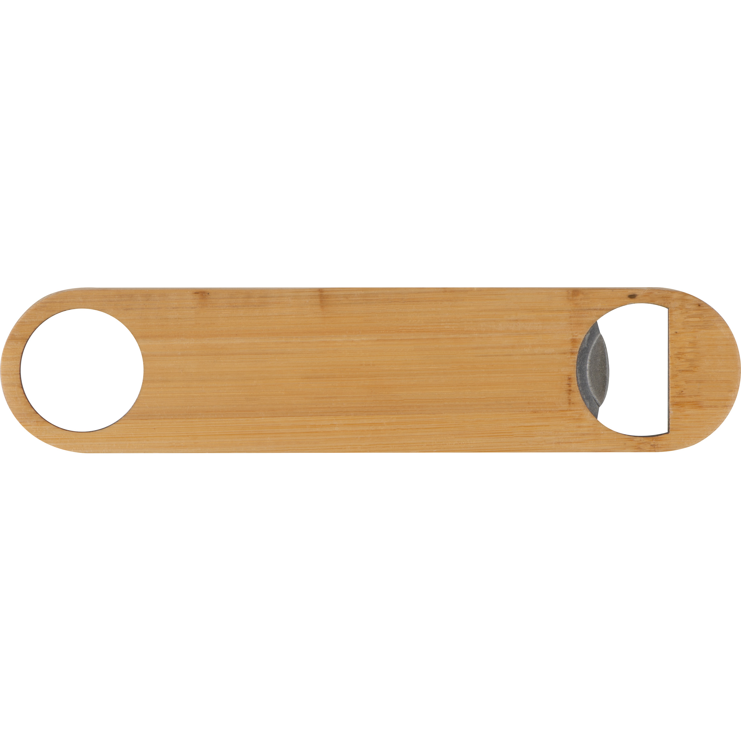 Großer Flaschenöffner aus Edelstahl mit einer Bambusseite. Ihre Werbung wird auf die Bambusseite graviert.