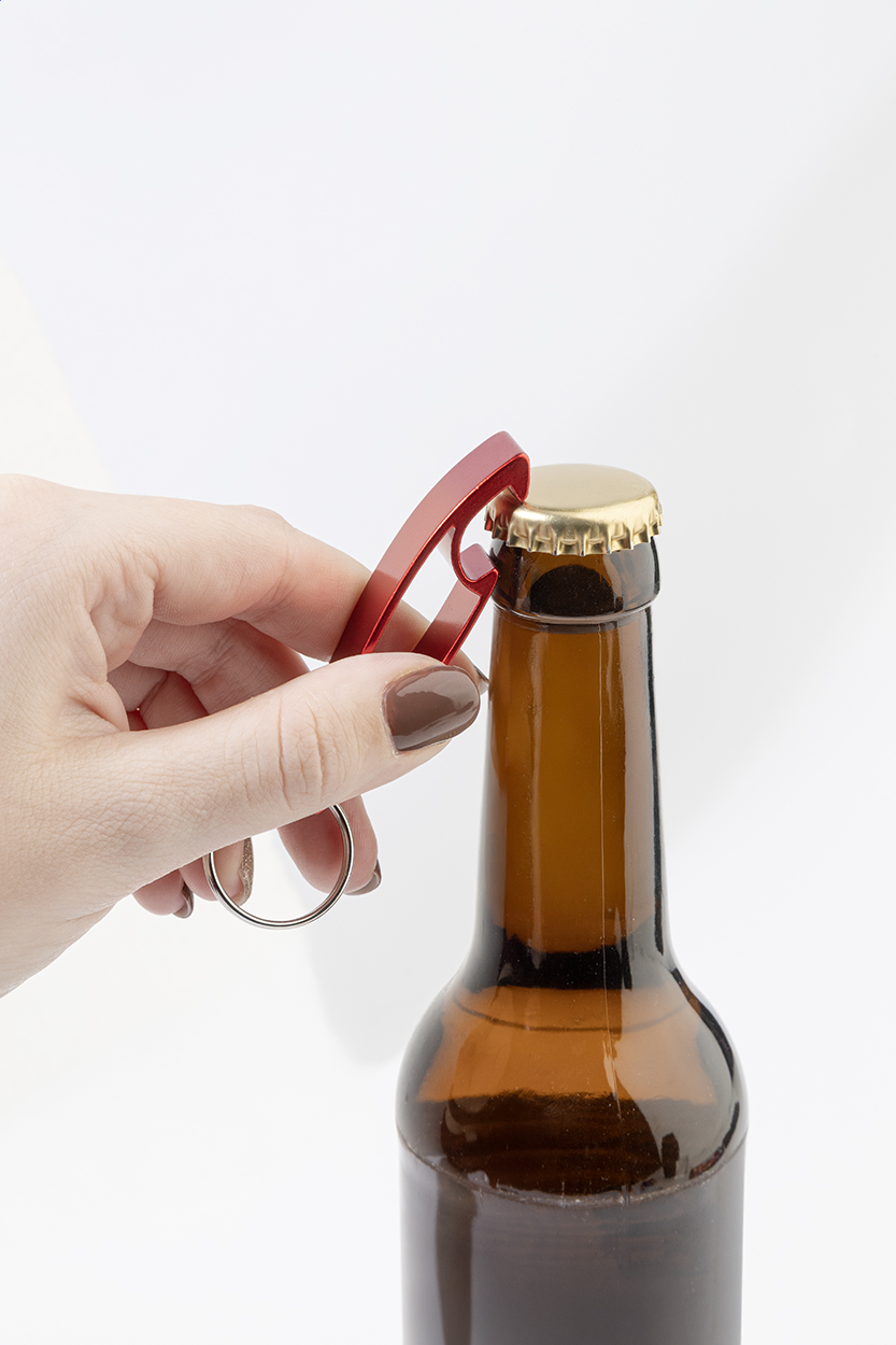 Flaschenöffner aus recyceltem Aluminium mit Schlüsselring aus Metall.