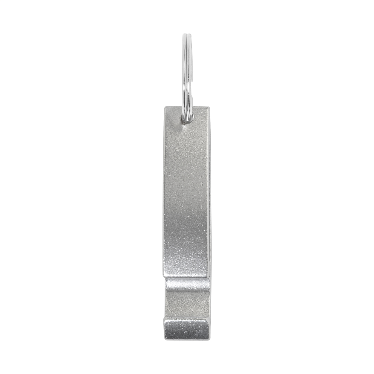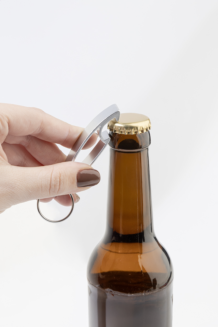 Flaschenöffner aus recyceltem Aluminium mit Schlüsselring aus Metall.