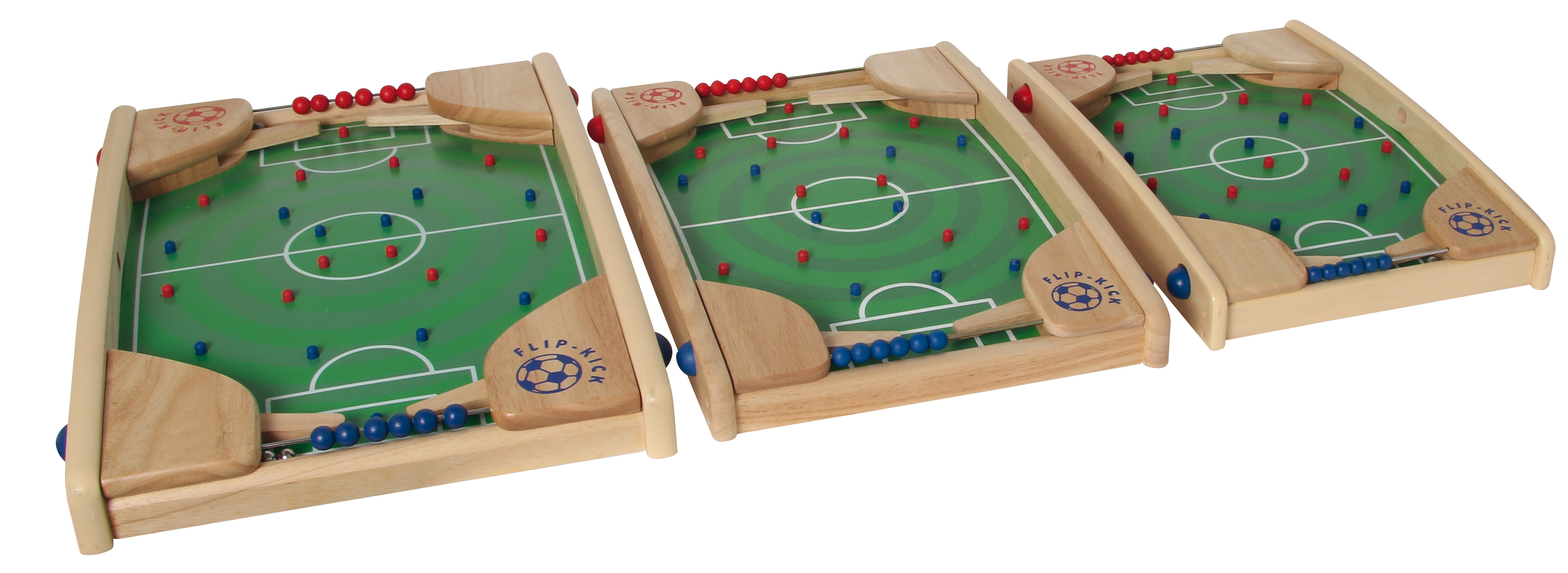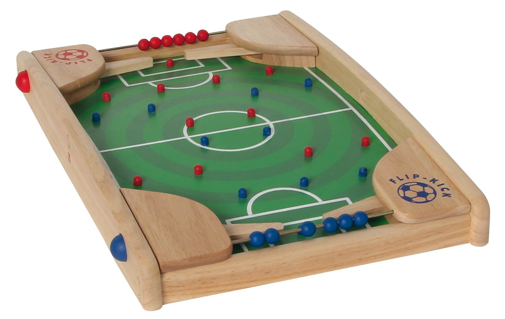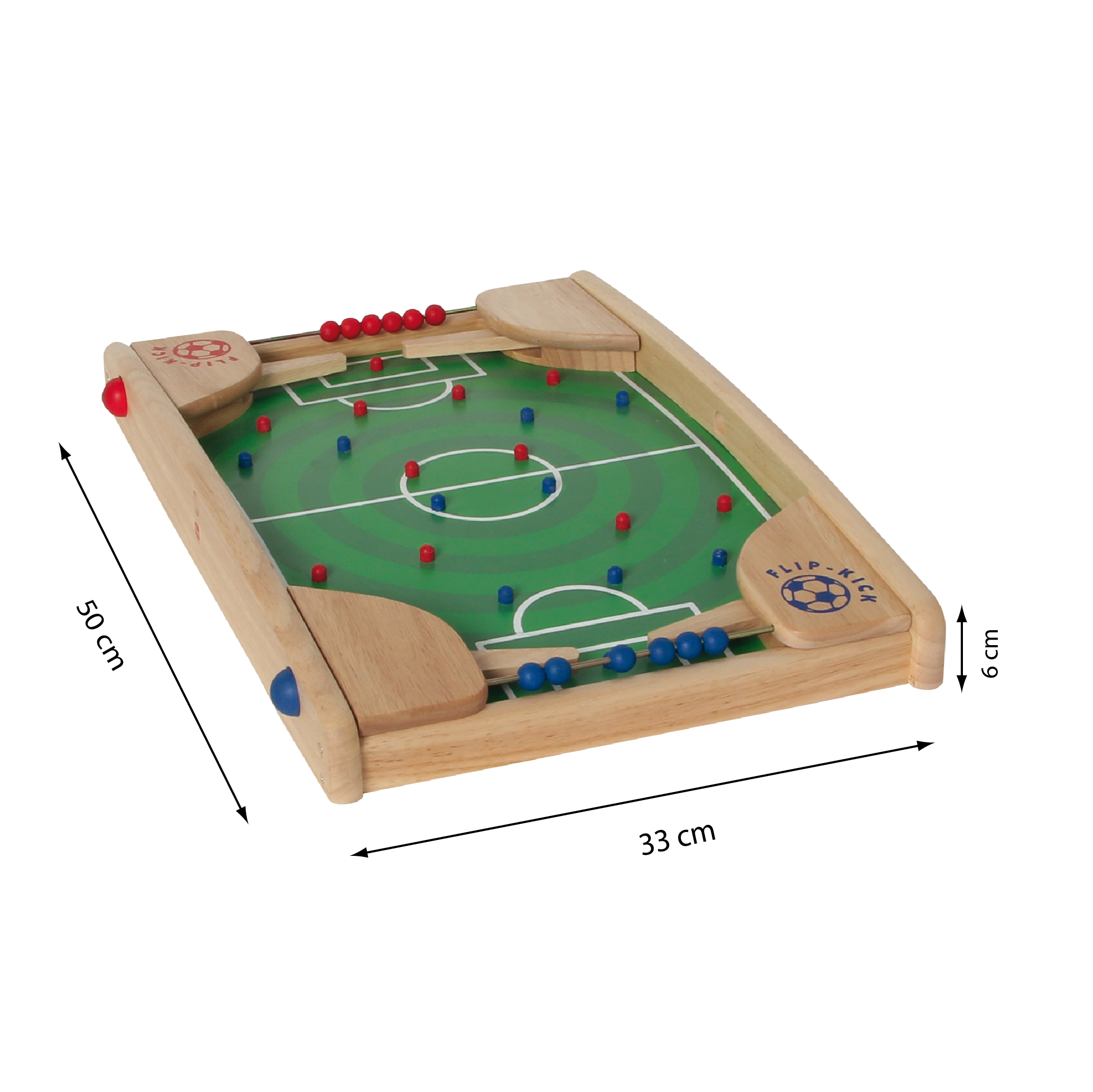 Ein toller Fußballspaß für zwei Ballkünstler. Eine Mischung aus Flipper und Kicker. Die Spielfläche ist so gewölbt, dass die Kugel immer zu einem der beiden Tore rollt. Das Spiel beginnt mit dem Einwurf der Metallkugel durch eines der Startlöcher in den seitlichen Rahmenteilen. Durch drücken der Flipper-Hebel versucht jeder Spieler, die Kugel ins gegnerische Tor zu schießen. Schon kleine Kinder können das! Koordination und Reaktion werden so spielerisch trainiert. Gefertigt aus nachhaltig produziertem Gummibaumholz und lackiert mit gesundheitlich unbedenklichern Farben.
