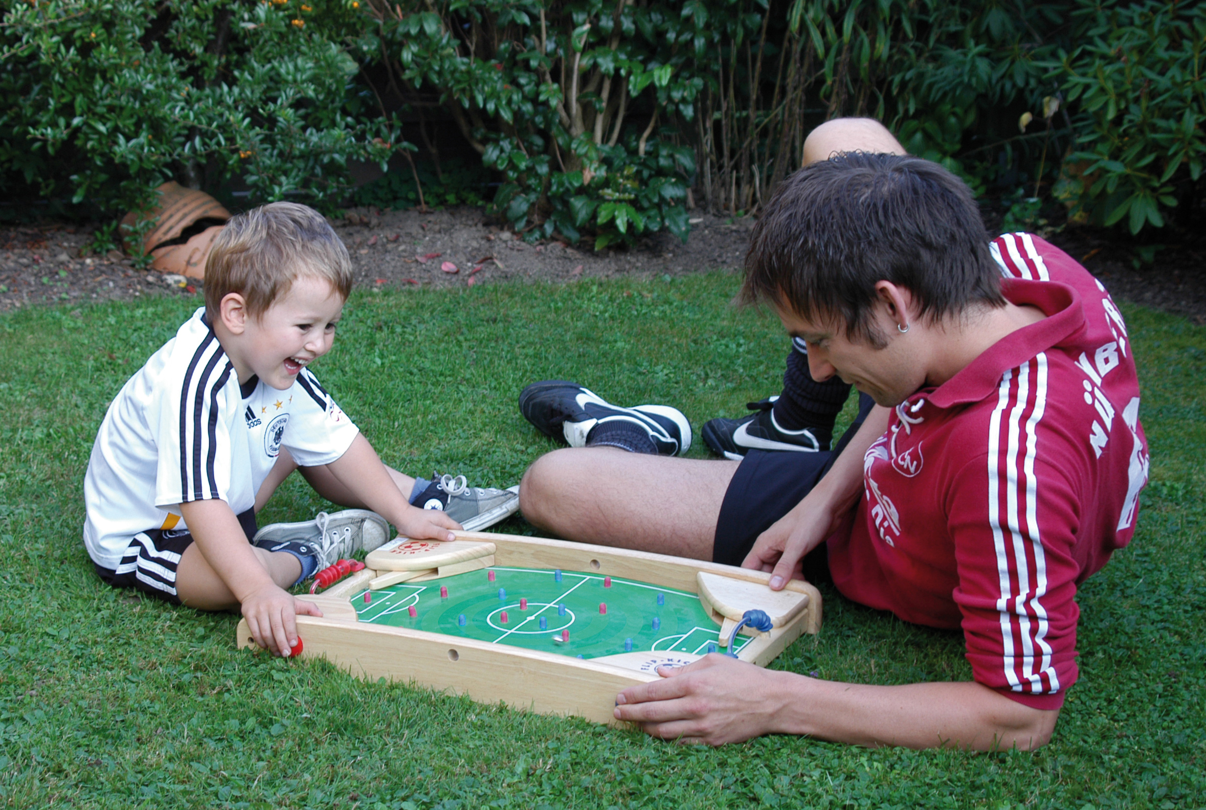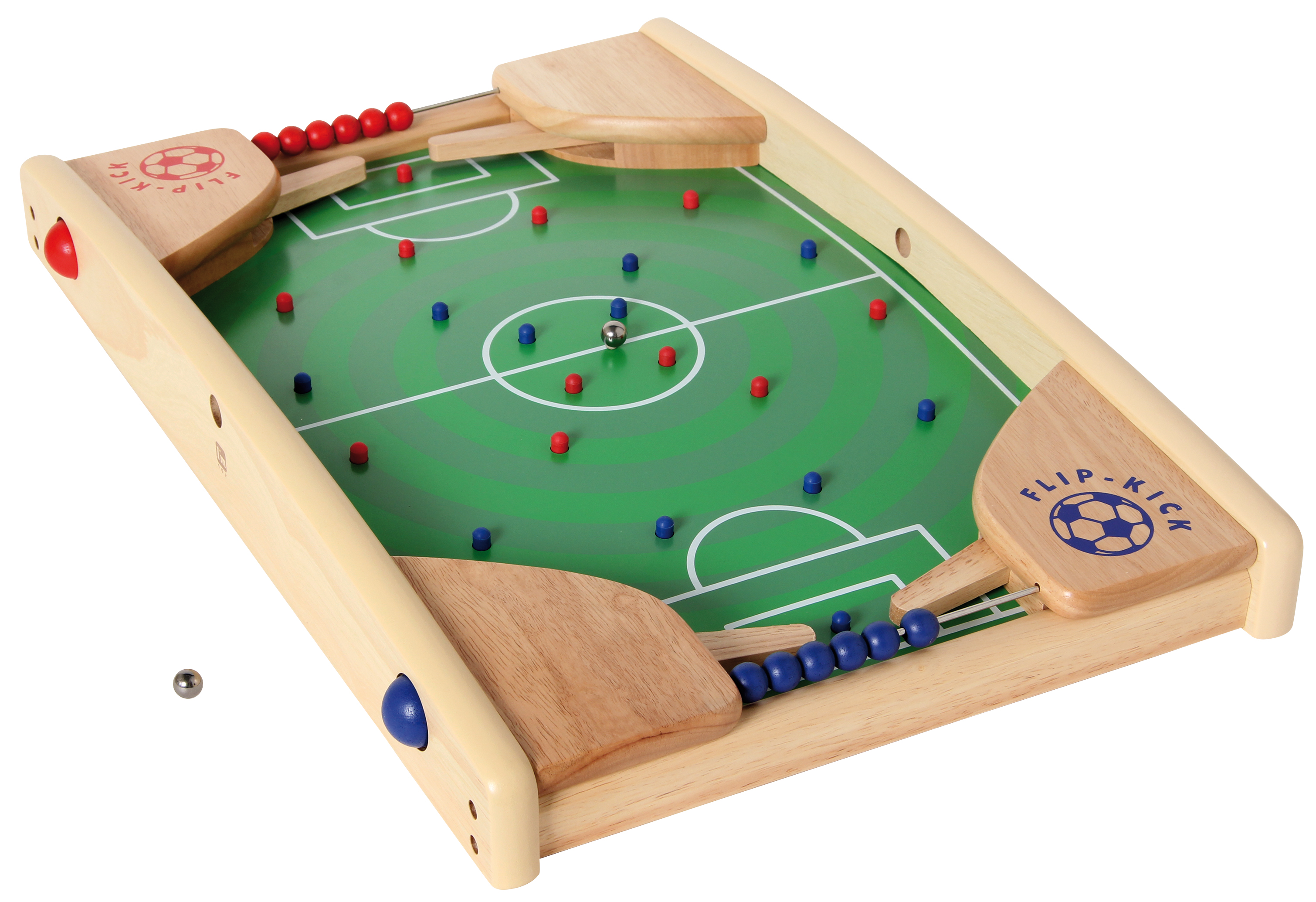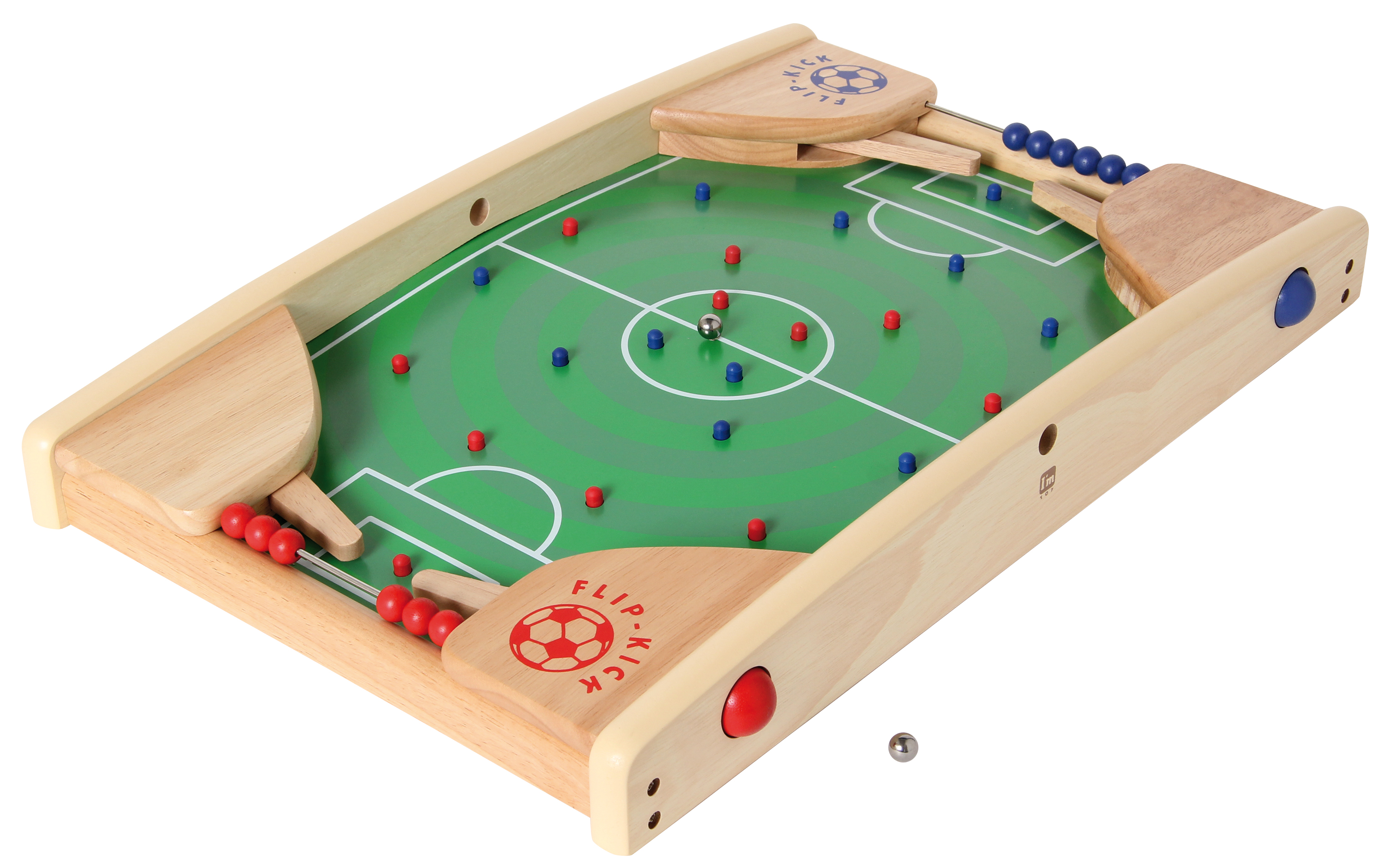Ein toller Fußballspaß für zwei Ballkünstler. Eine Mischung aus Flipper und Kicker. Die Spielfläche ist so gewölbt, dass die Kugel zu einem der beiden Tore rollt. Das Spiel beginnt mit dem Einwurf der Metallkugel durch die Startlöcher in den seitlichen Rahmenteilen. Dann schießen die Spieler die Kugel mit den Flipper-Schenkeln in Richtung gegnerisches Tor. Auf jeder Seite werden die erzielten Tore mittels Holzperlen dargestellt. Schon kleine Kinder im Alter von 3 bis 4 Jahren erlernen die richtige Technik sehr schnell. Das Spiel macht aber Jugendlichen und Erwachsenen genauso viel Spass. Je nach Können der Akteure wird es sehr flott. Es fördert bei den Kindern Koordination und Reaktion. Die Technik ist ausgereift und sehr robust, Verschleißteile sind nicht vorhanden. Somit ist Spielspaß über viele Jahre garantiert.